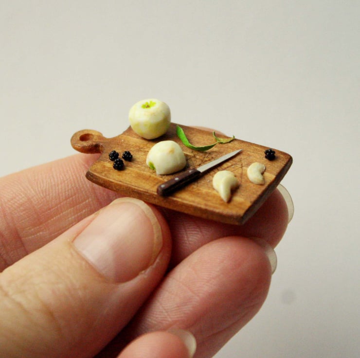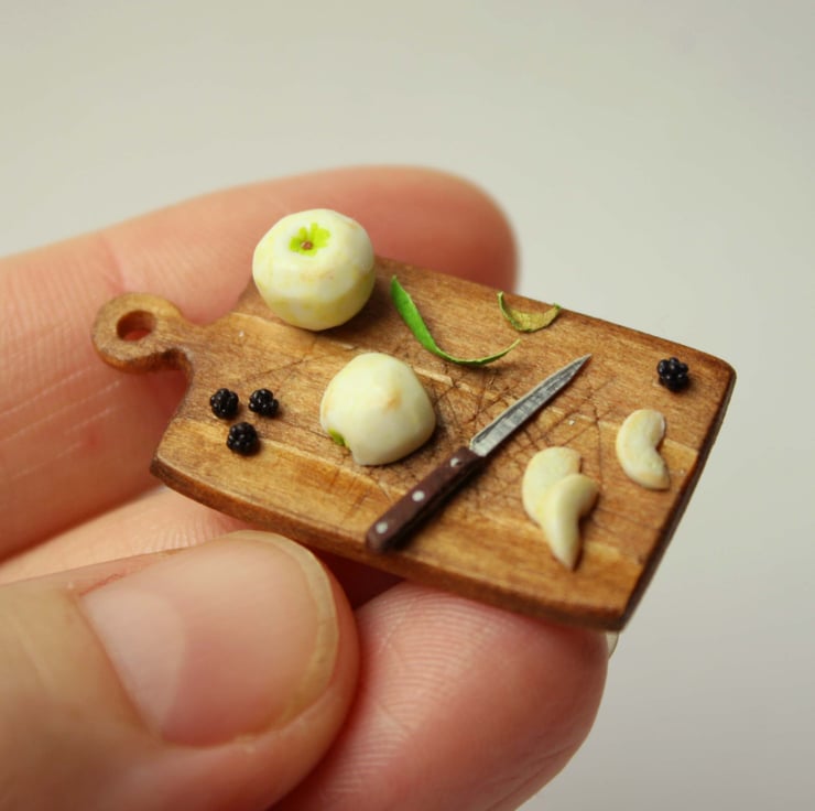 A hand carved, aged wooden chopping board with polymer clay apples, blackberries, knife and peelings glued down.