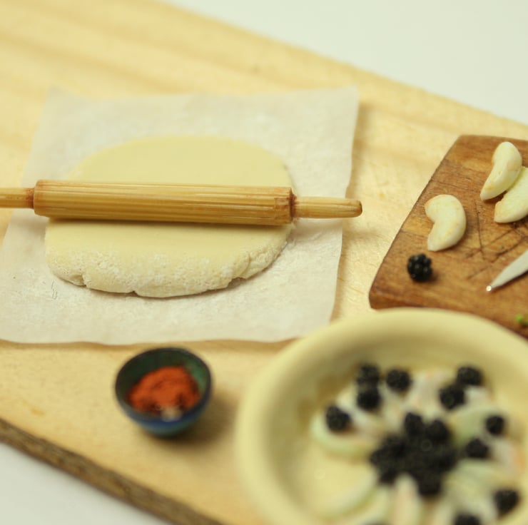 Pastry in the process of being rolled out by a hand made wooden rolling pin glued on.