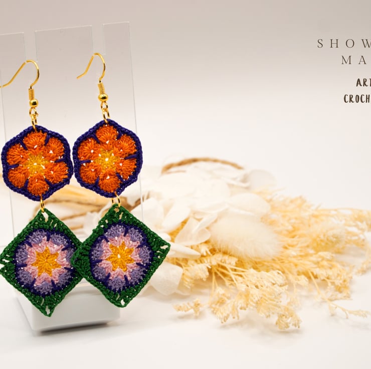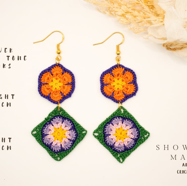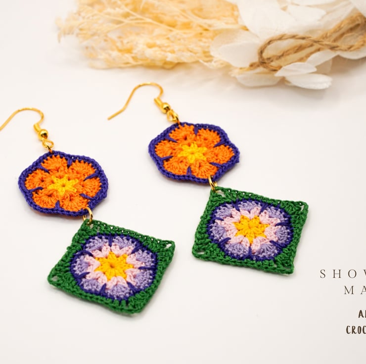 Featuring a motif of flowers and Granny Square geometric patterns, these earrings are unique and stylish accessories that will accentuate your individual style and attract admiring glances from those around you.