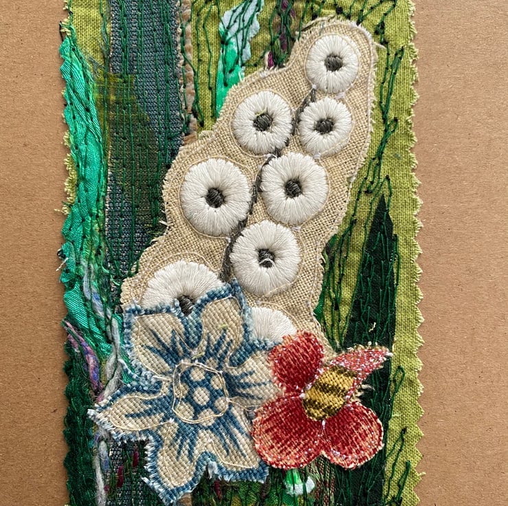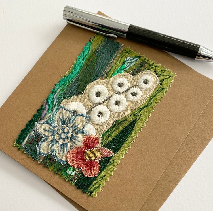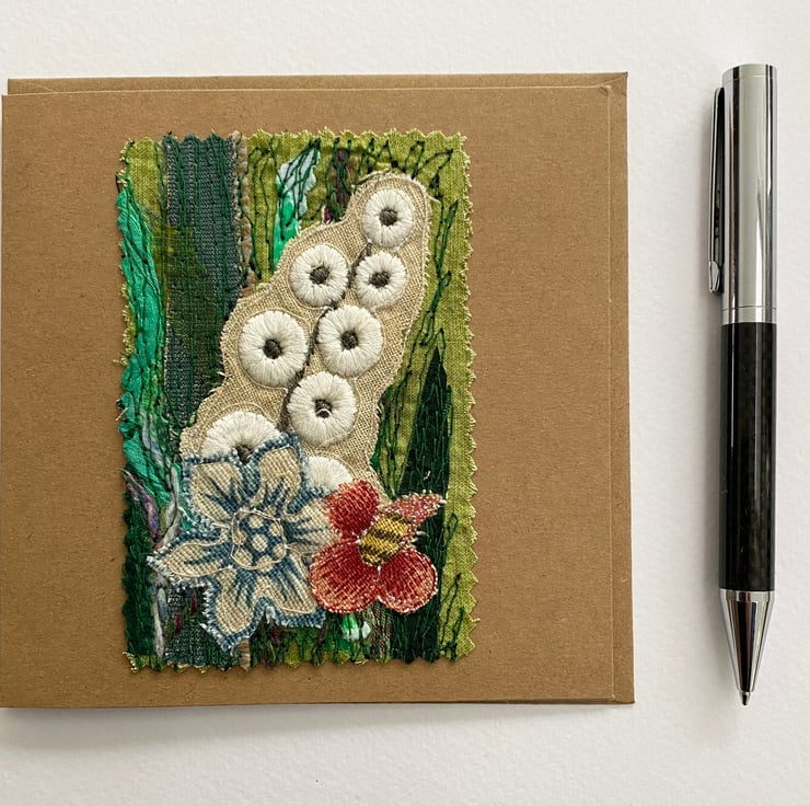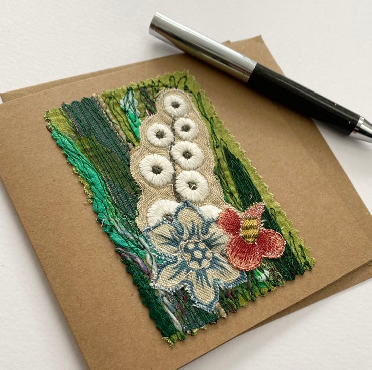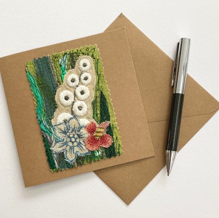 This flower garden embroidered card has been made with my own handmade up-cycled fabric, upholstery fabrics and enhanced with free motion embroidery. It’s perfect for special people and any occasion. It is blank inside. This recycled brown card measures 13.5 x 13.5cm, comes with an envelop and in a plastic cover for protection.