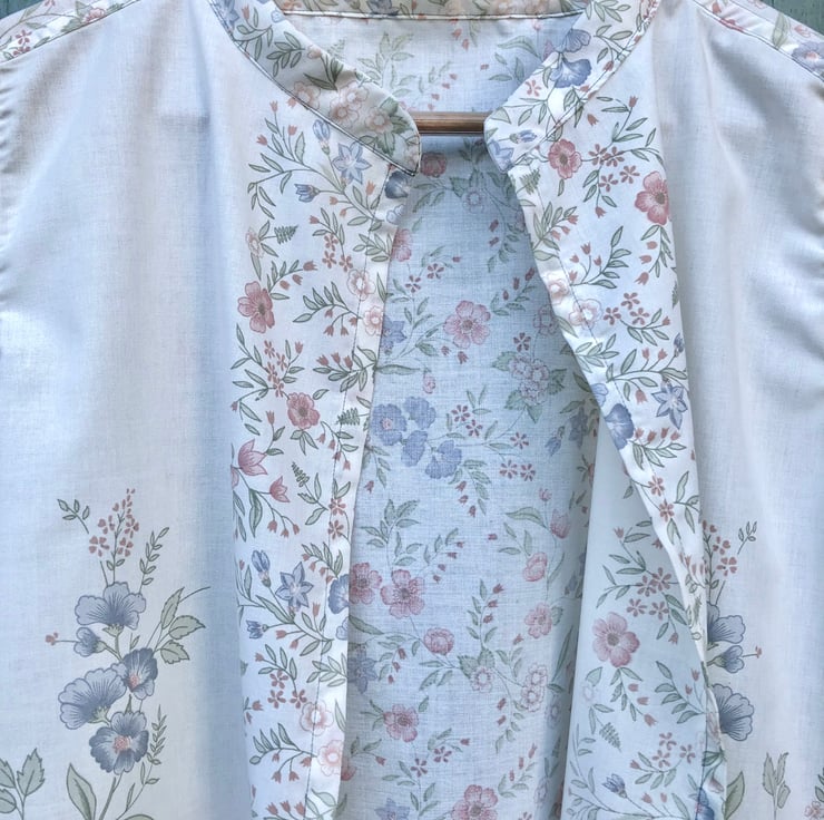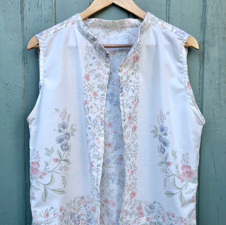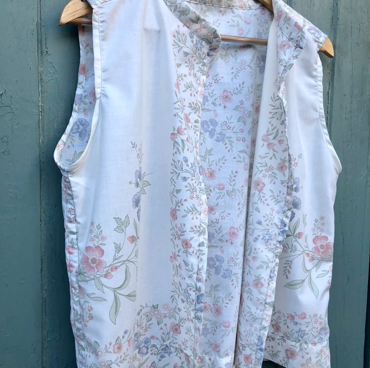 A wonderful gilet ready for the Spring/Summer season! Made from up-cycled fabric. Lovely soft and floaty material. A delicate floral pattern.