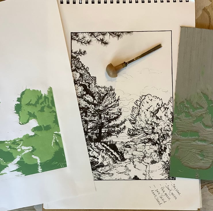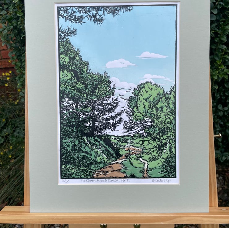 One of my original handprinted Linocuts of the Coastal Path between Holkham Beach and Burnham Overy Staithe.