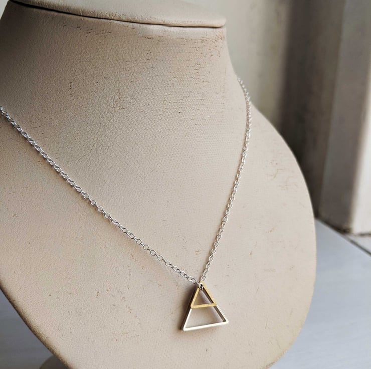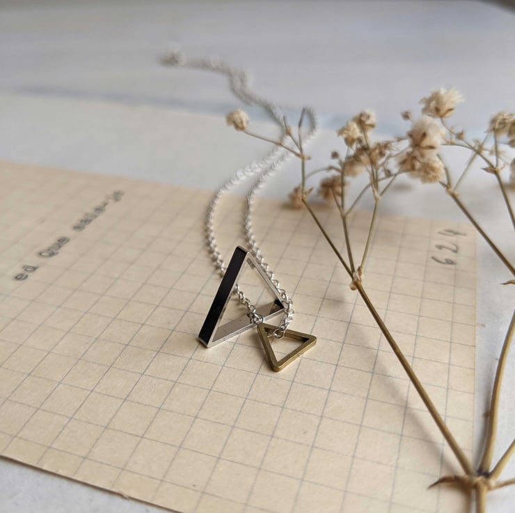 These delicate pieces are layered on super fine silver chain to create a beautiful geometric necklace. Silver plated triangle with a smaller golden brass triangle inside. Each moves separately on the chain. Beautifully minimal.
