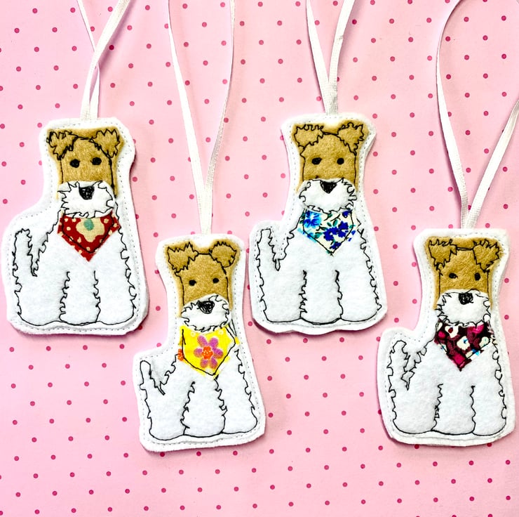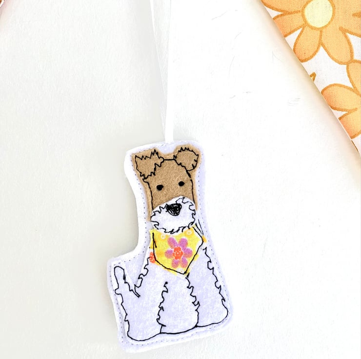 I have made this keepsake gift from free Motion embroidery and multiple layers of felt. Each one I make has a different colour bandana and a different personality please see my other listings for other colours. This listing is for a yellow floral bandana fox terrier.