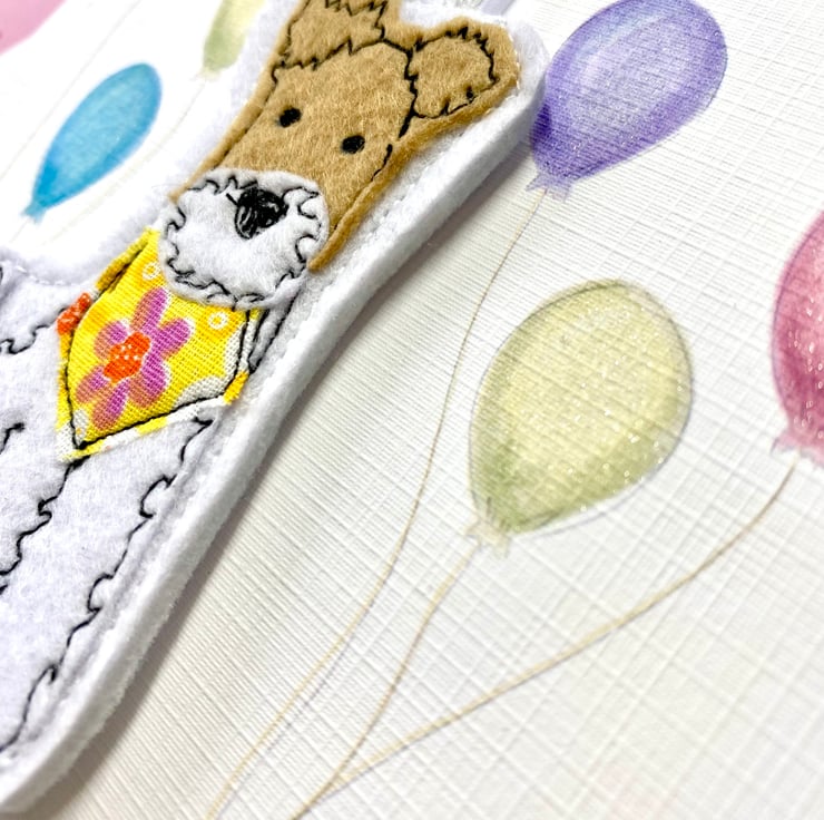 The cheeky wire haired fox terrier birthday card makes a great gift for any terrier or dog lover. This cute free Motion embroidery felt decoration is based upon my own cheeky fox terrier named Freddie.