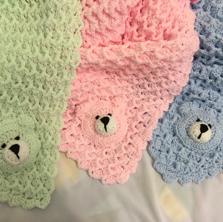I used James C Brett’s Shimmer D.K. which is 90% Acrylic 10% Viscose and is machine washable on a 40 degrees synthetic cycle. I produced these three blankets which measure on average 35” x 45” without being stretched, in the following colours.