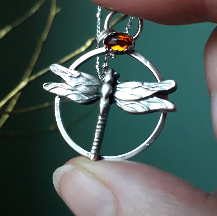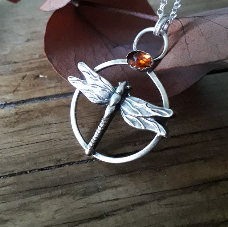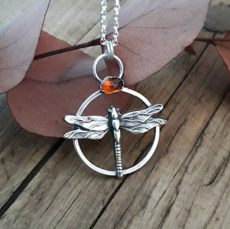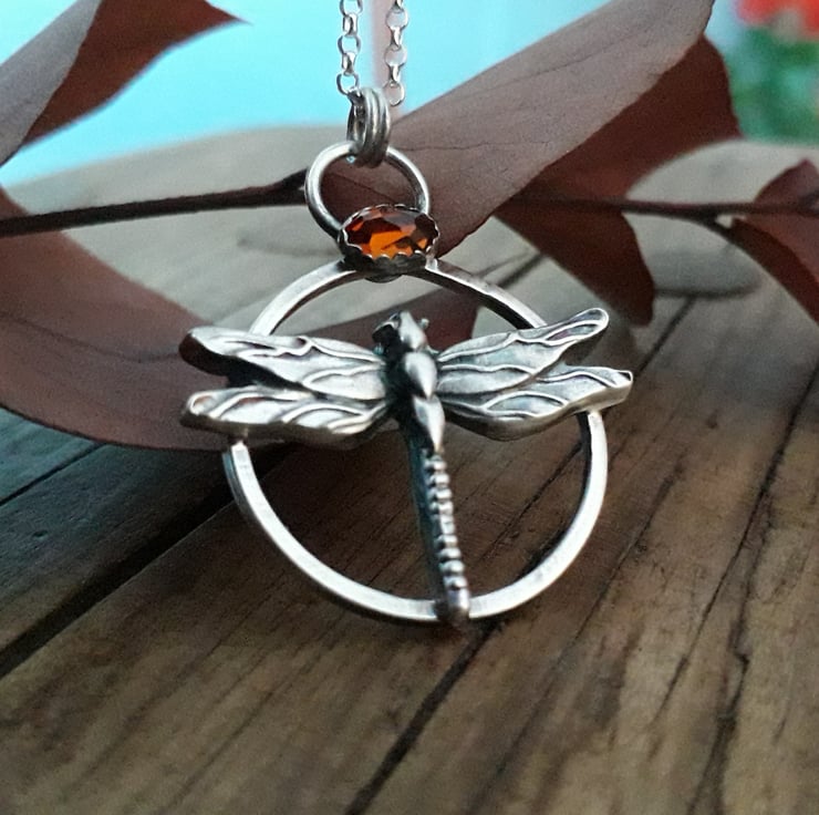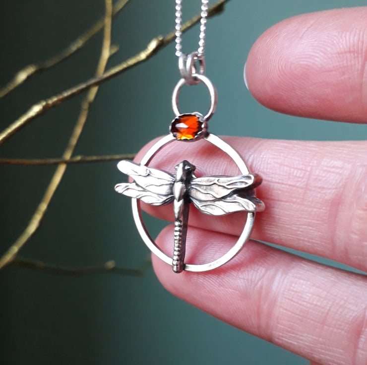 This dragonfly has beautiful wing and body details with a bit of blue shimmer on both sides and a beautiful rich and warm hessonite garnet above it.