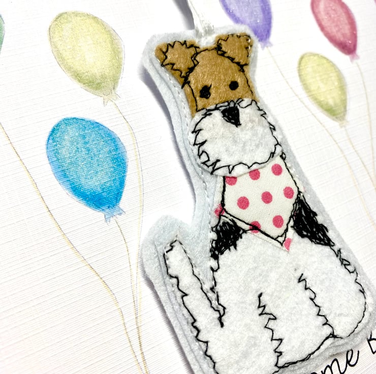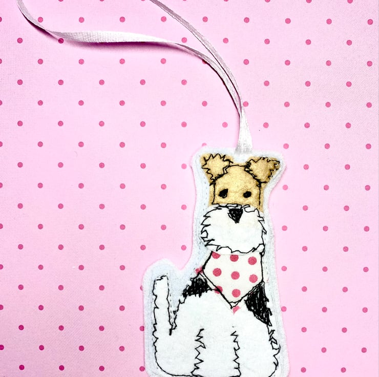 I have made this keepsake gift from free Motion embroidery and multiple layers of felt. Each one I make has a different colour bandana and a different personality please see my other listings for other colours. This listing is for a pink spotty bandana fox terrier.