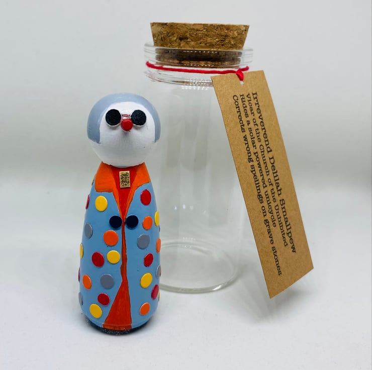 The Irreverend Delilah Smallpew is the vicar of the Church of the Unhibited in the village of Badgerbank. The village being set in the south of Pegshire, the land where the Pegnoses live. She can often be seen in the lanes around the village wizzing round on her solar powered unicycle or correcting misspellings on grave stones.