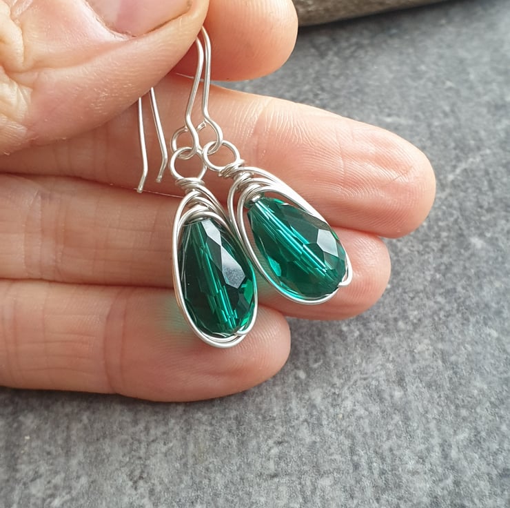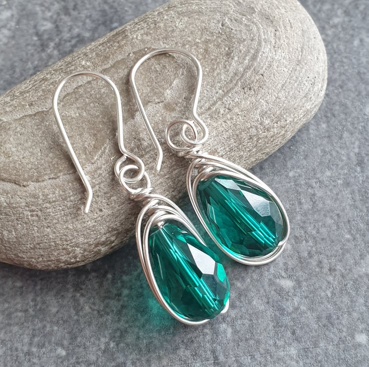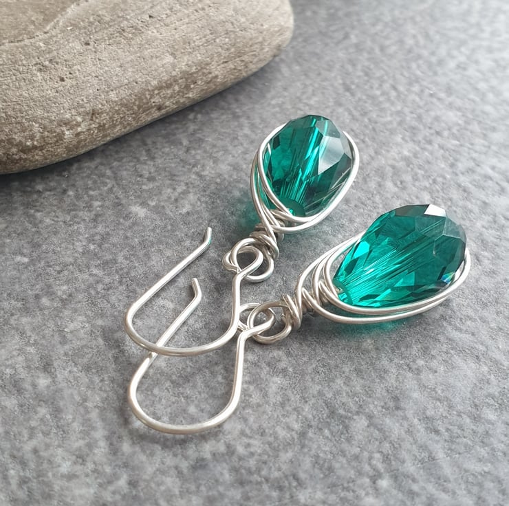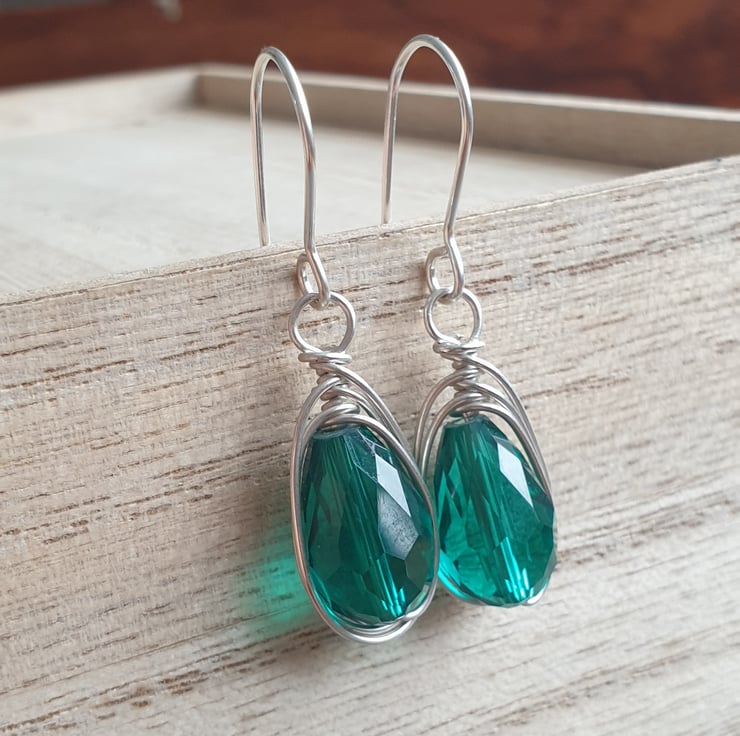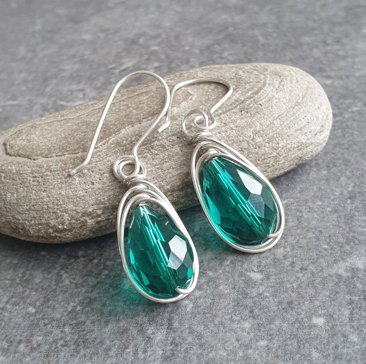 These stunning raindrop inspired earrings feature faceted crystal glass teardrops in teal, wrapped in sterling silver wire and attached to handmade silver earwires. The deep aqua really pops against the silver and they look amazing when the light shines through them!