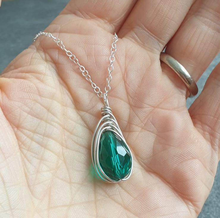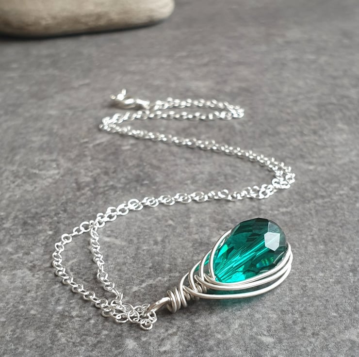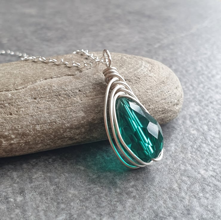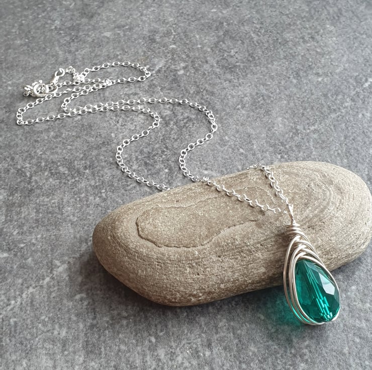This pretty pendant is made from sterling silver wire, wrapped around a sparkly facet cut glass crystal teardrop in bright teal, suspended from a dainty sterling silver chain. The deep aqua glass and silver is a stunning combination which looks lovely when the light hits it.