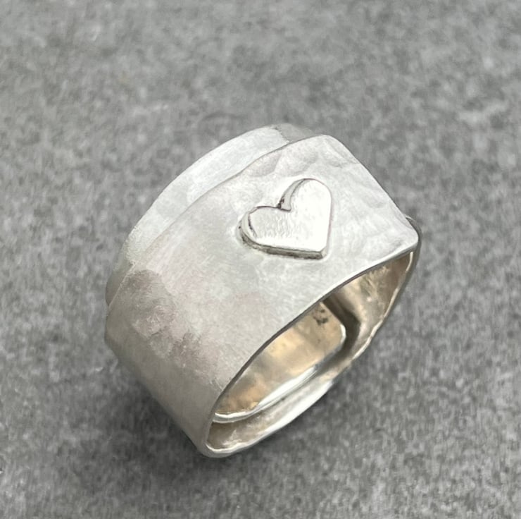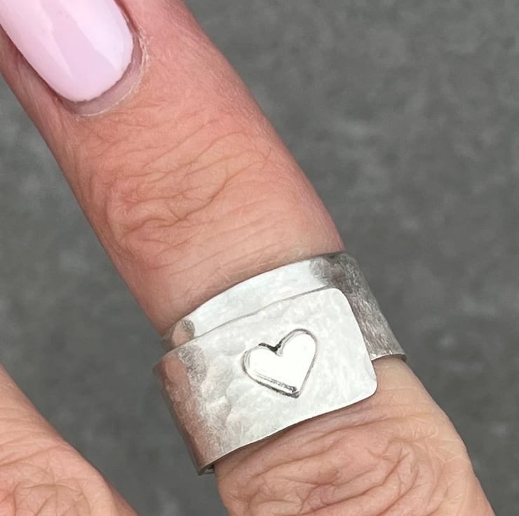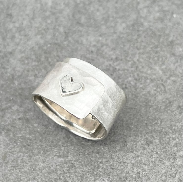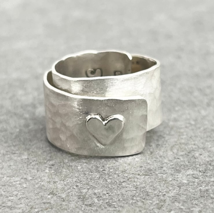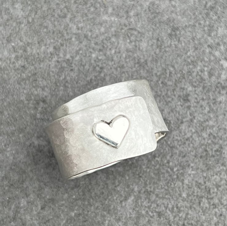 Silver Heart Adjustable Ring, silver heart ring, wide hammered ring, wrap over