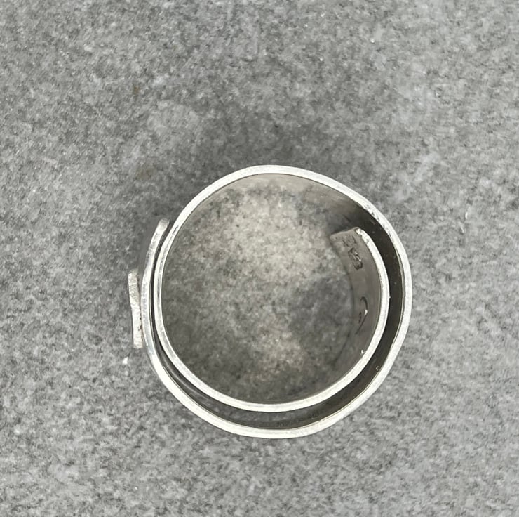 This Silver Heart Adjustable Ring is made from hammered Sterling Silver and features a shiny silver heart. The width of the ring is approximately: 1cm but once it’s staggered, it measures a little more. Let me know at Checkout the rough size you need, where you then have flexibility either side to alter. This ring has a satin silver finish but please let me know if you want it all shiny.