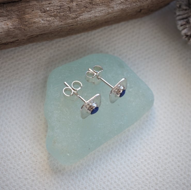 The earrings are approximately 8mm along each straight edge with a 4mm setting. The lapis lazuli is a lovely dark blue colour that compliments the polished silver perfectly. They are small, stylish earrings, practical and comfortable for everyday wear.