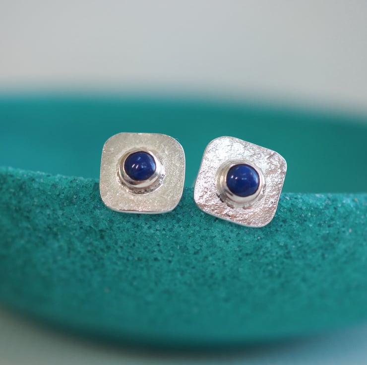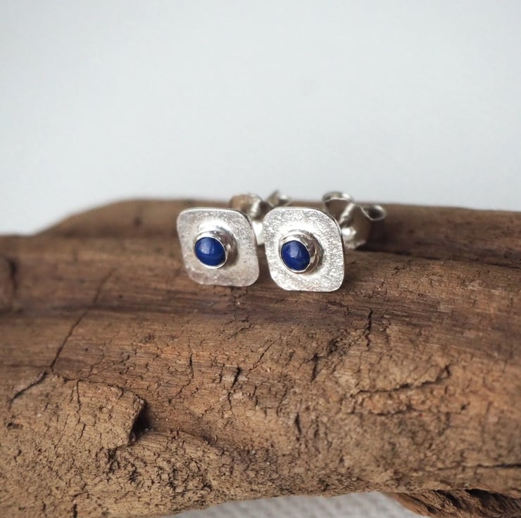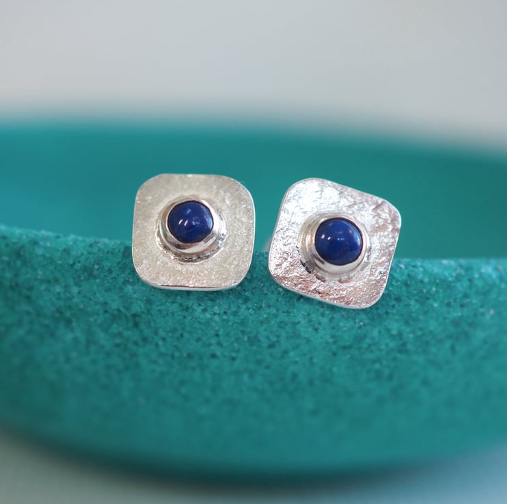A square of recycled sterling silver has been textured with a vintage hammer and set with a small blue lapis lazuli stone. These earrings are square (ish) but not completely uniform. I have soldered the ear pin central to the earring so that they can be worn square or diamond shaped.