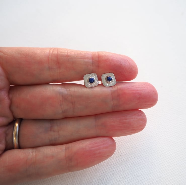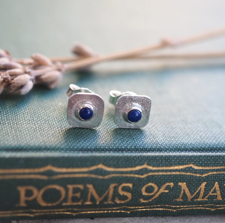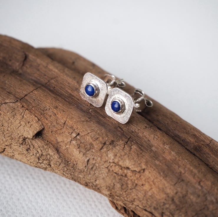 Beautiful square silver stud earrings set with blue lapis lazuli.