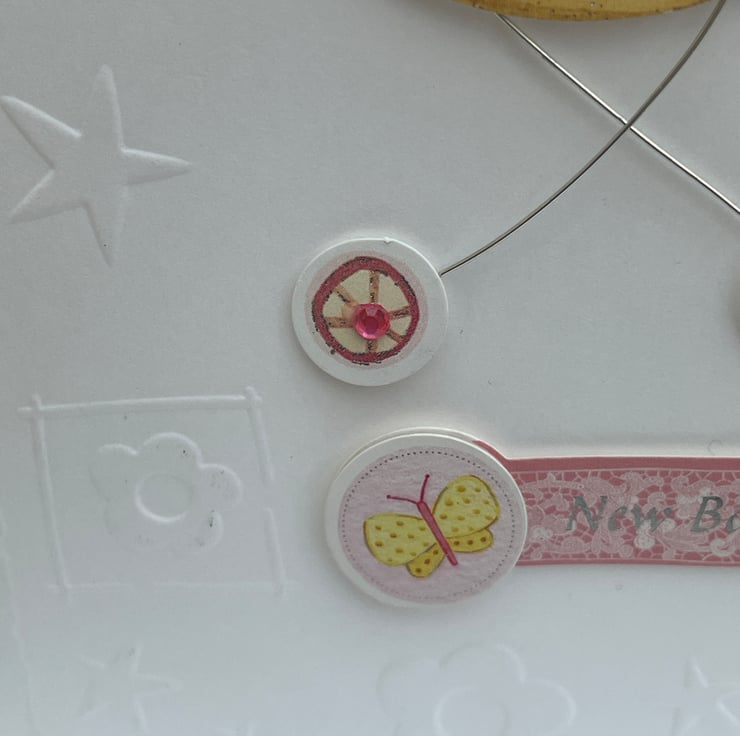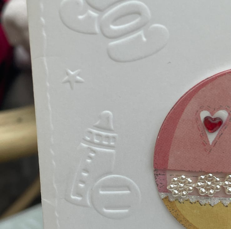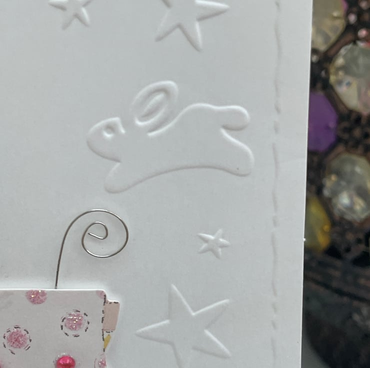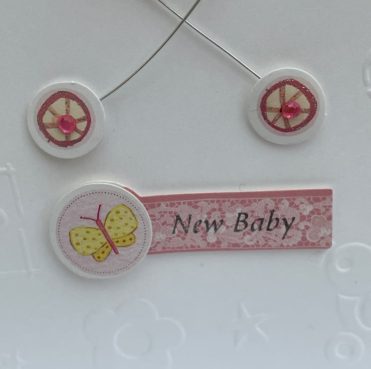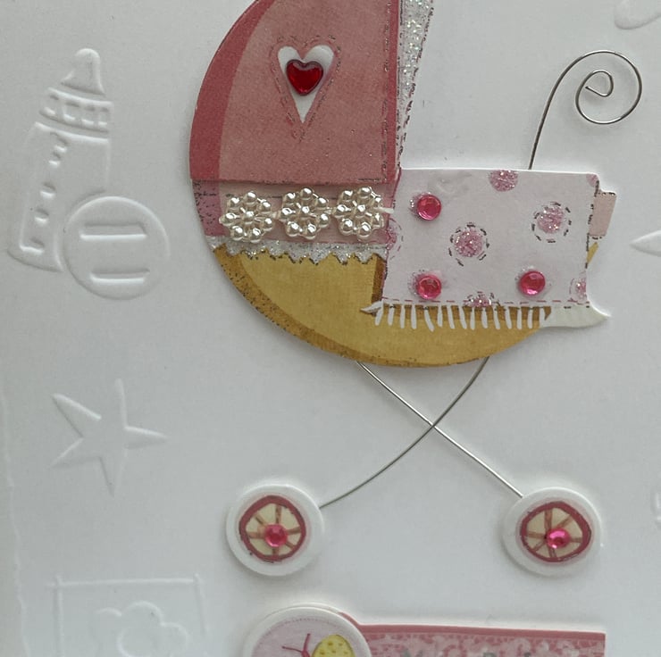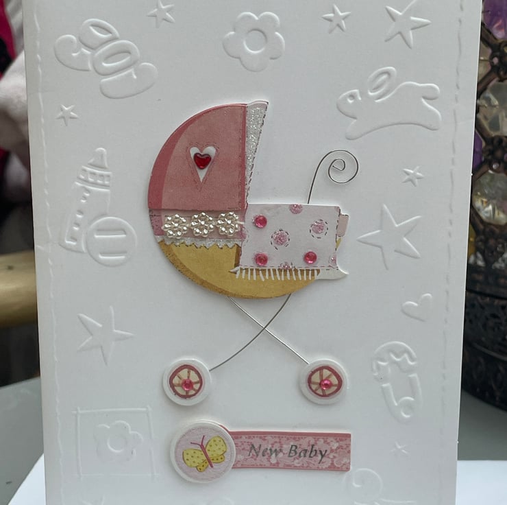 A clean and simple yet cute new baby card. This 17x11.5cm card has a beautifully embossed base. The embossing is of bottles, flowers, stars and bunnies - all things baby. This is topped with the cutest of prams in pink and yellow with gem and pearl embellishments. The image is 3D and has wire as a handle and to the wheels. Under this is the greeting New baby with a butterfly decoration. It would be great for a baby girl but the choice is yours, a gorgeous card for a special new arrival.