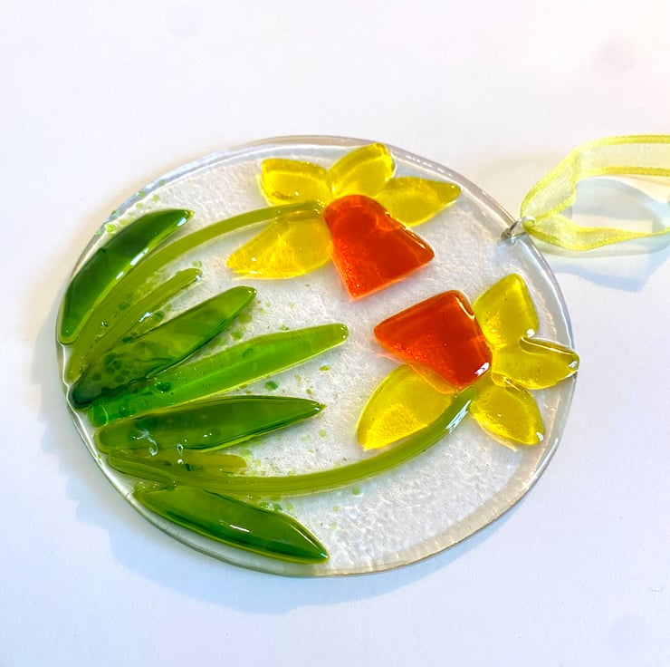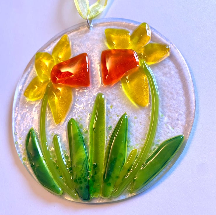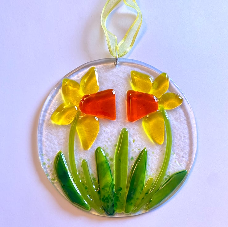 Beautiful Unique hanging handmade glass daffodil sun catcher .