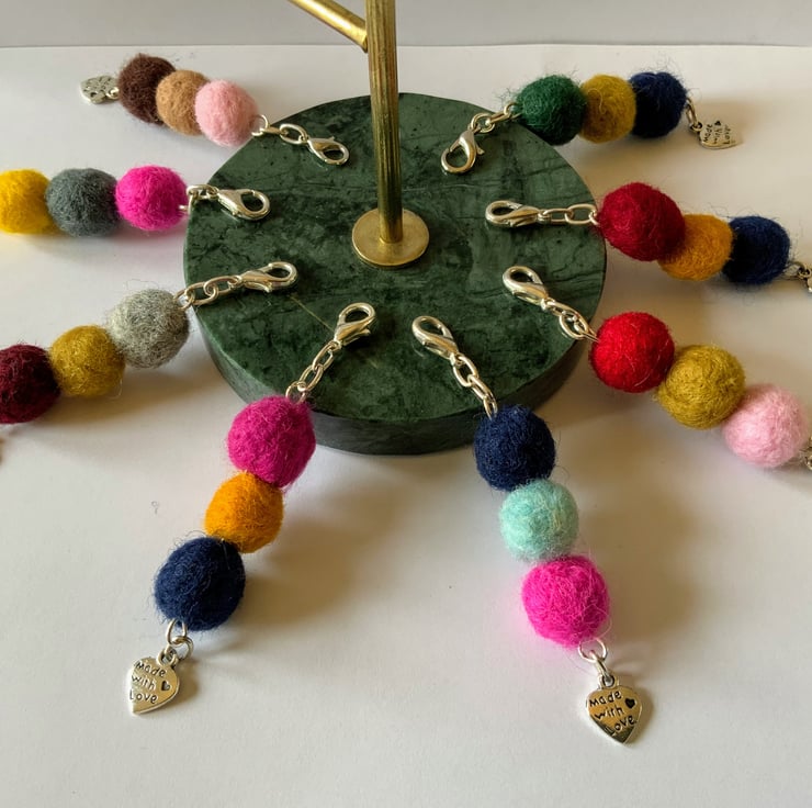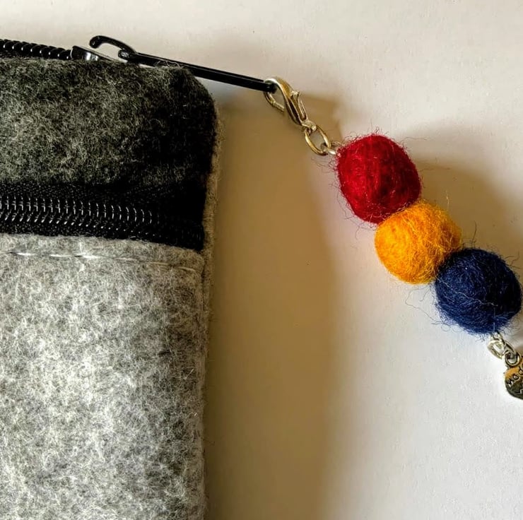 Three merino wool balls in red, yellow and navy blue hanging with a "Made with love" heart charm.