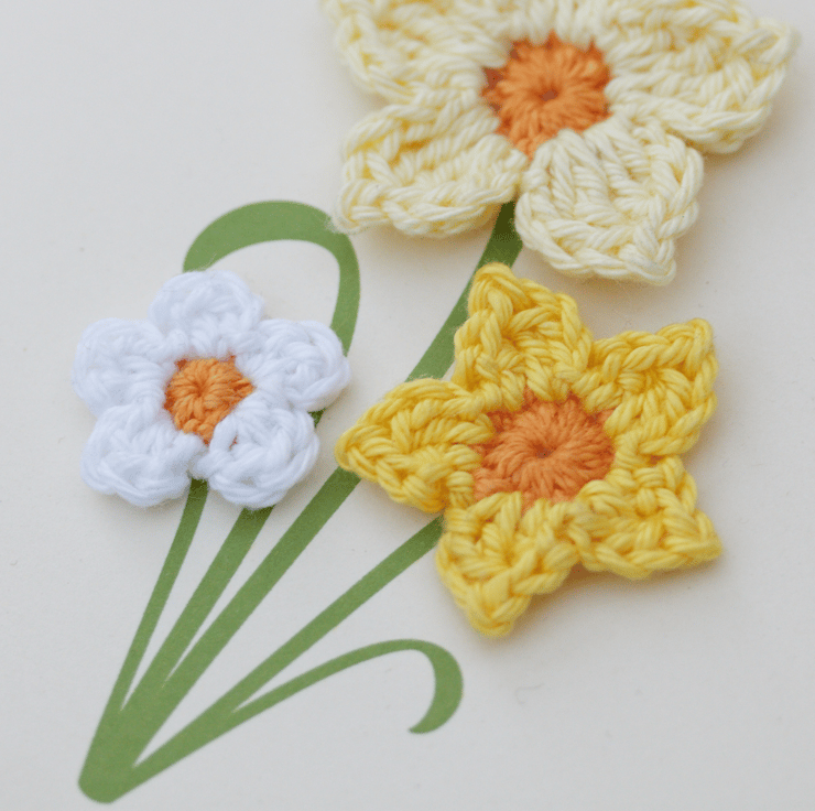 Easter card decorated with handmade crochet cotton daffodils. Happy Easter greetings card.