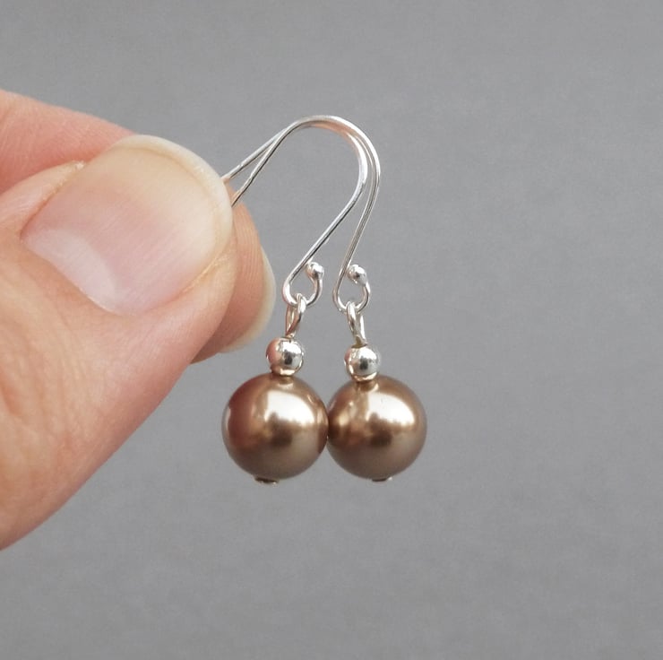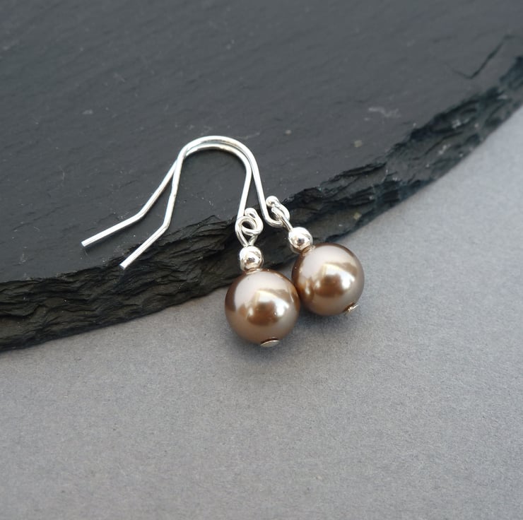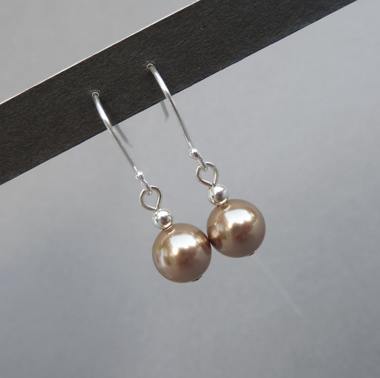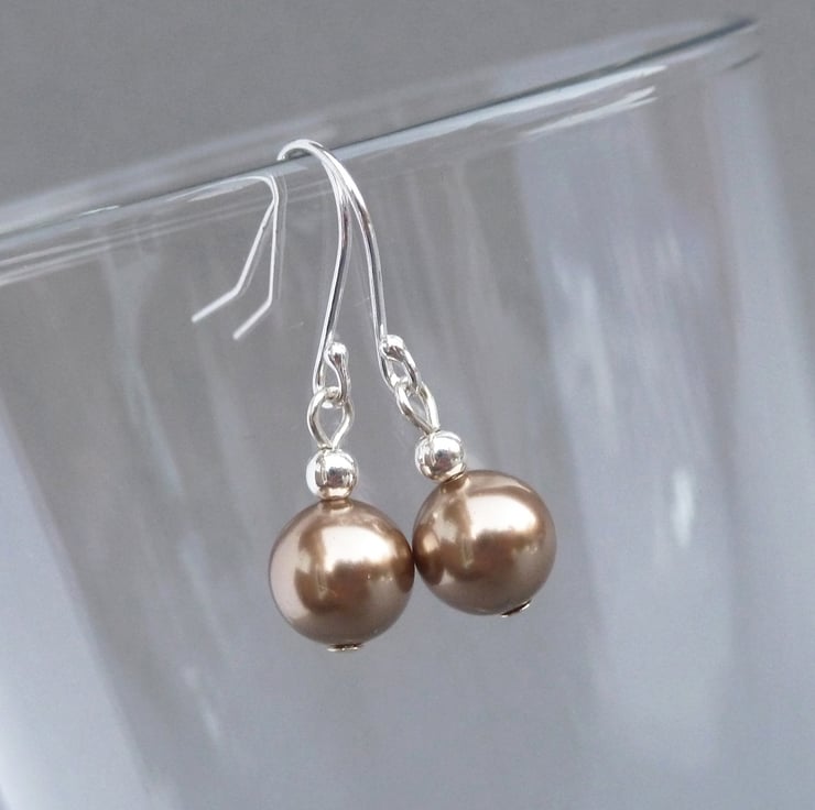 8mm bronze glass pearls have been used to create these simple bronze pearl earrings. Their simple design and the lustre of the pearls make these dangle earrings perfect for both everyday wear or a special occasion.