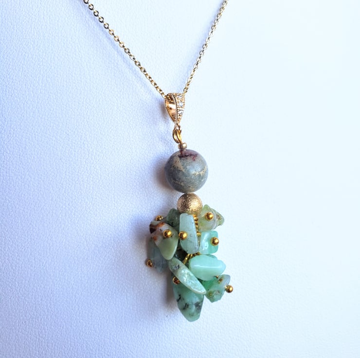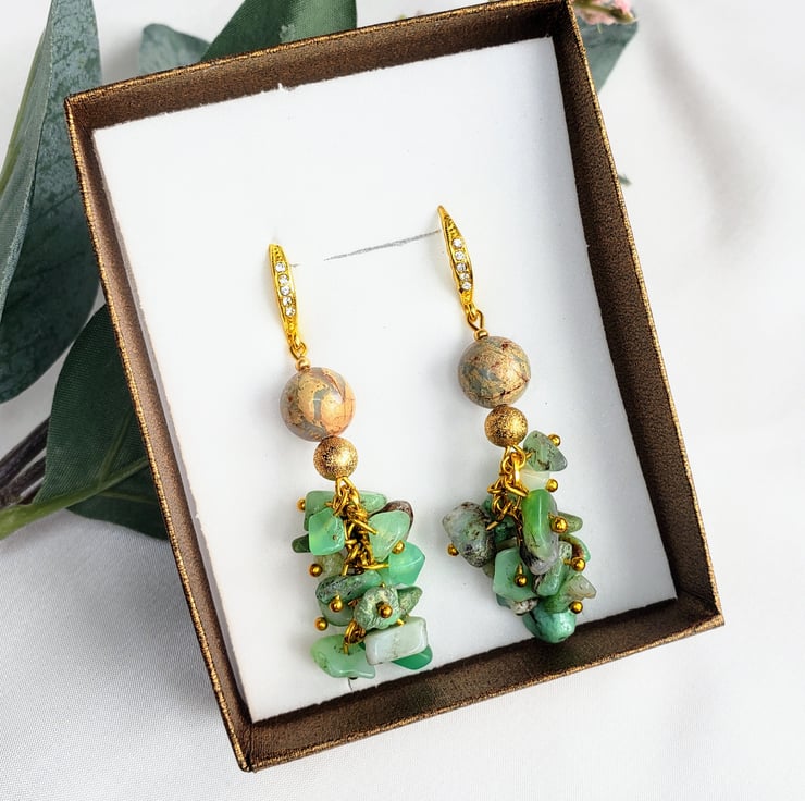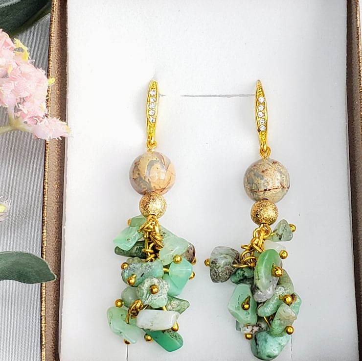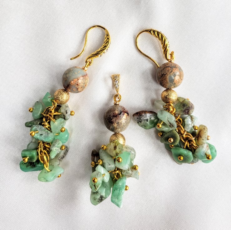 This is Australian Jade and Impression Jasper jewellery set. This set was created by me, using gold colored findings with rhinestones . The combination of jade and jasper make this piece of jewellery unique and one of a kind. Perfect for gift for your mom, wife or girlfriend as a birthday gift, Christmas or anniversary gift.