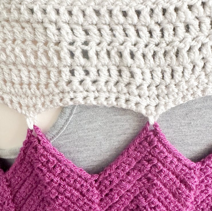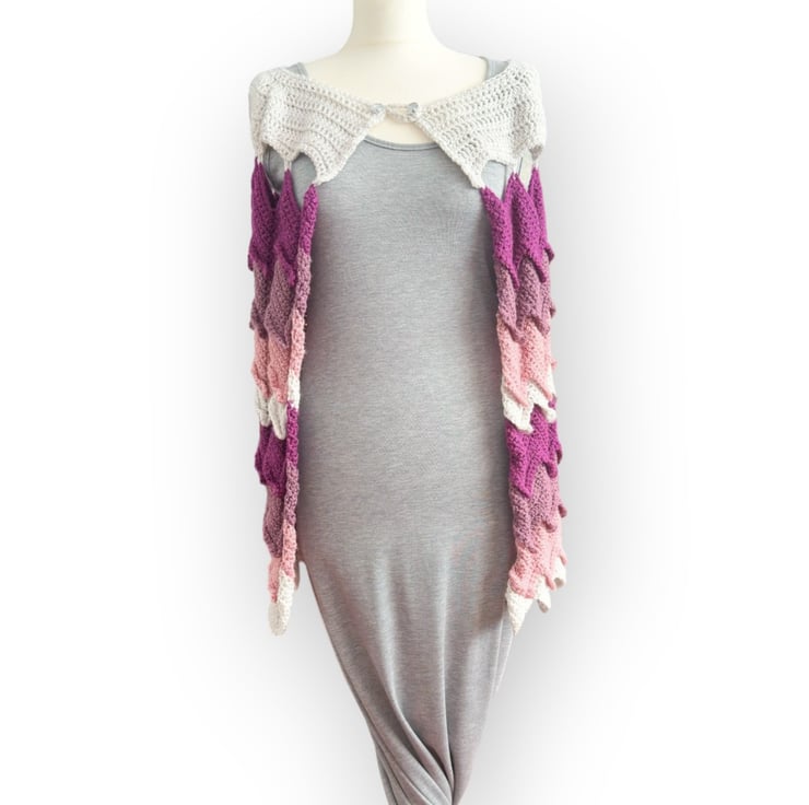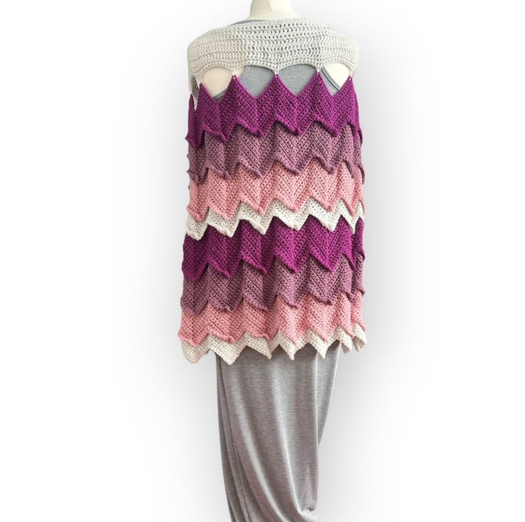 This women’s cape is a beautiful blend of elegance and comfort, crocheted from 100% DK yarn in overlapping chevron stripes of rich plum, deep grape, soft pale rose, and Hint of Silver white.
