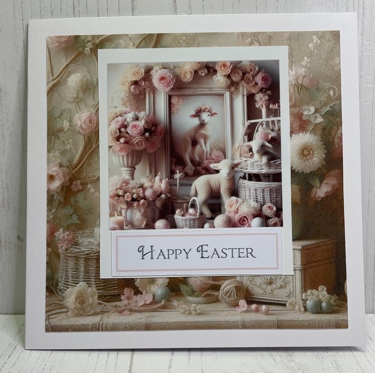 7” x 7” white card and envelope, pretty vintage scenic paper as the background, Happy Easter sentiment. A photo topper of a cute lamb.