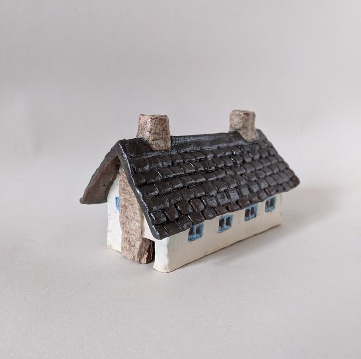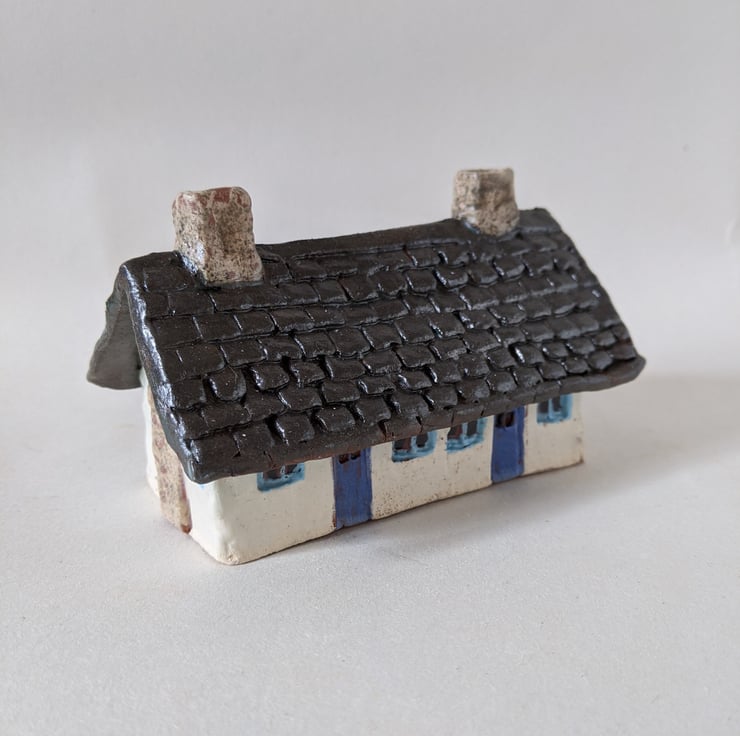 Welsh Slate Roof Cottage ornament. All items are made from scratch. I draw and plan each building then cut the pieces out of clay. I add textures and details then build them. Once they are assembled I decorate them with coloured clays and oxides before the bisque firing then they are glazed and fired once more. Every little building is unique.