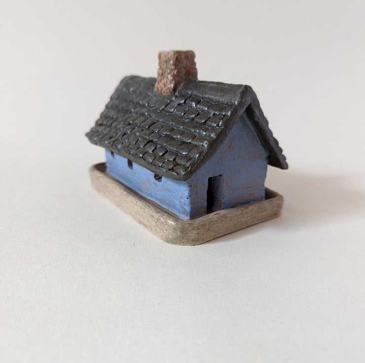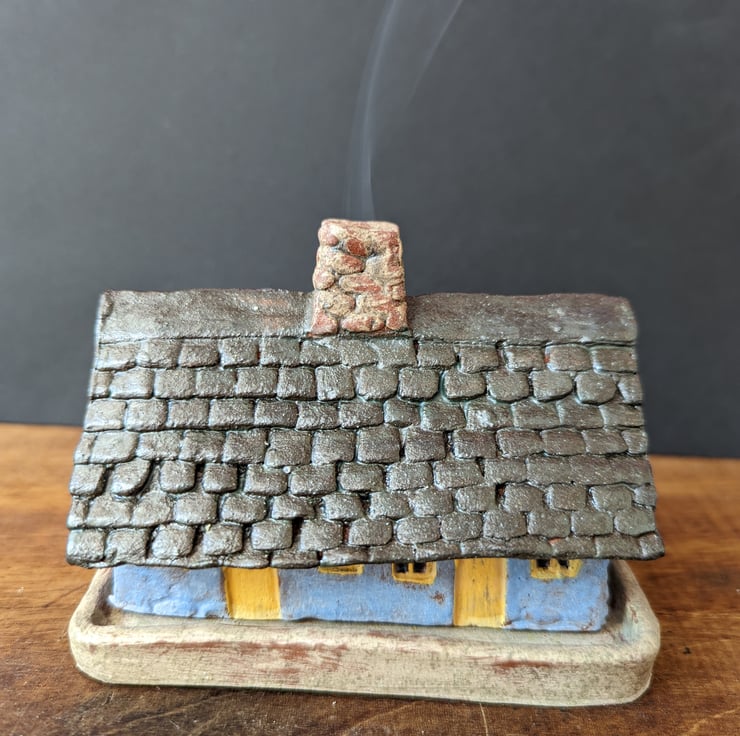 Cottage incense burner. All items are made from scratch. I draw and plan each building then cut the pieces out of clay. I add textures and details then build them. Once they are assembled I decorate them with coloured clays and oxides before the bisque firing then they are glazed and fired once more. Every little building is unique.