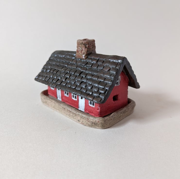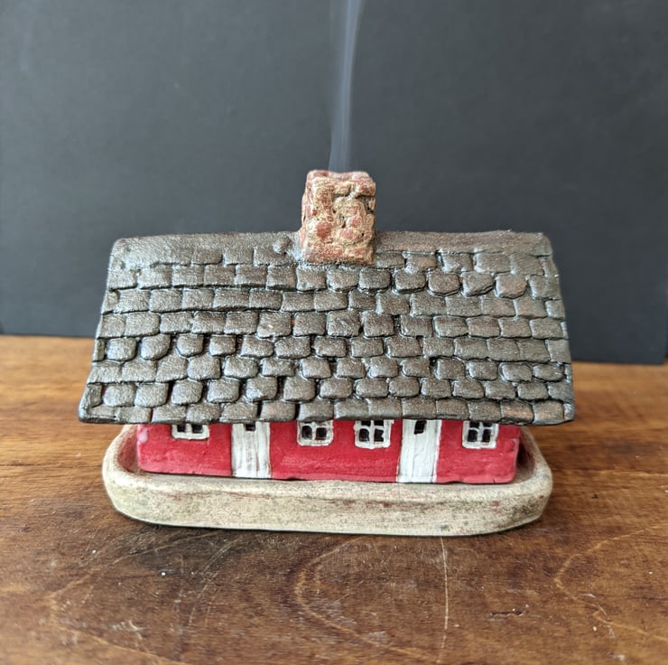 Cottage incense burner. All items are made from scratch. I draw and plan each building then cut the pieces out of clay. I add textures and details then build them. Once they are assembled I decorate them with coloured clays and oxides before the bisque firing then they are glazed and fired once more. Every little building is unique.