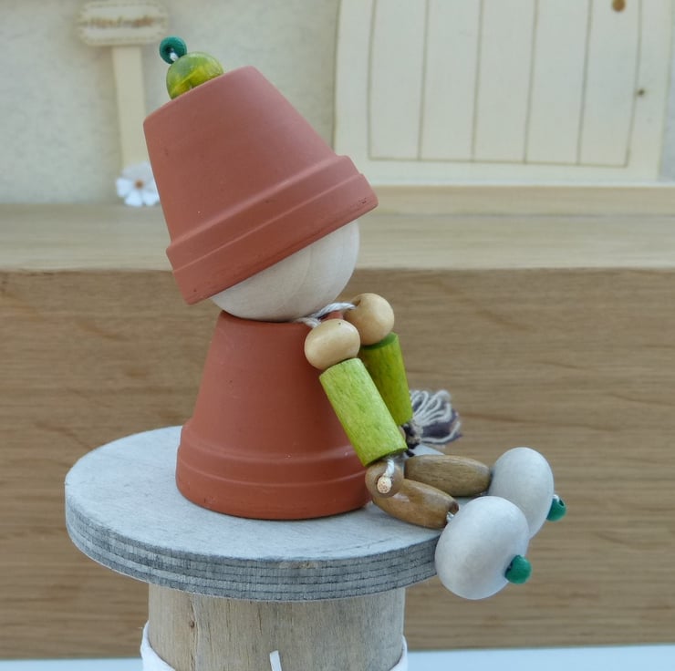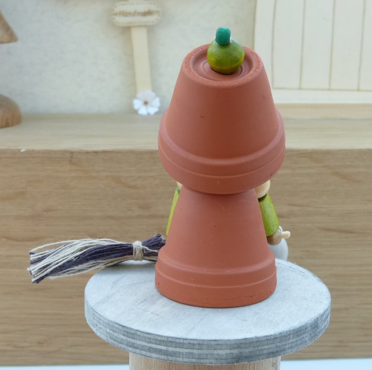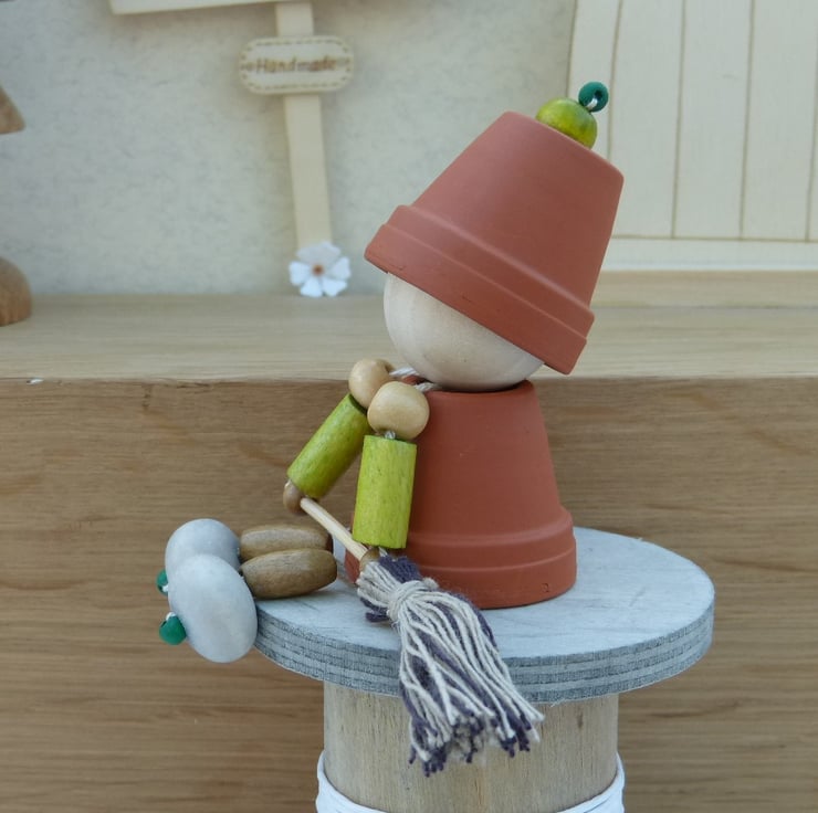 A terracotta flowerpot friend with wooden beads and cotton thread, holding a wooden handled cotton broom. Sitting at approx' 8cm in height.