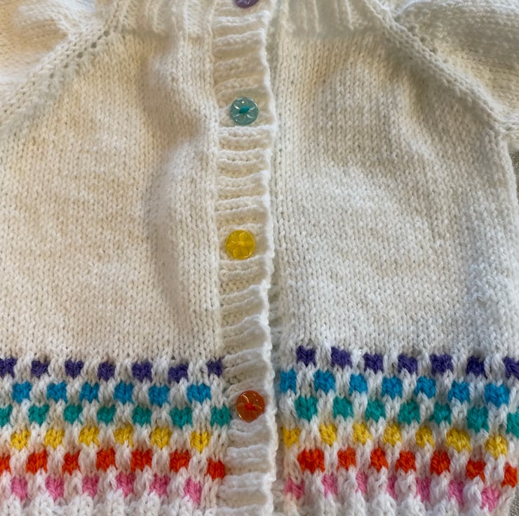 I love this pretty cardigan with lots of bright colours. It will complement many colours of baby clothes.