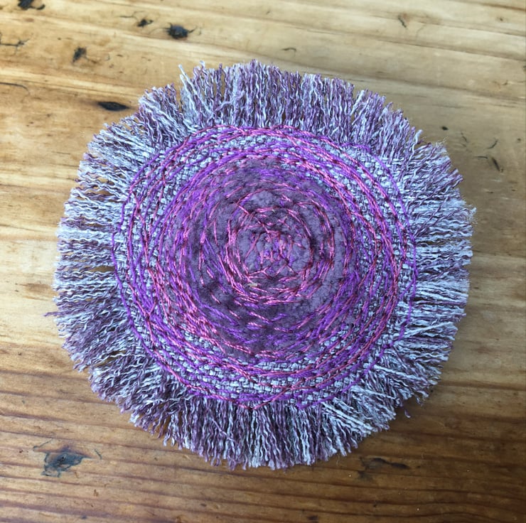 Each brooch is handmade and unique. I layer the tweed fabric and machine embroider the velvet centre. The edges are then frayed to give texture. A contemporary brooch in subtle shades of mauve, heather and purple. The perfect accessory with any outfit or to decorate a bag.