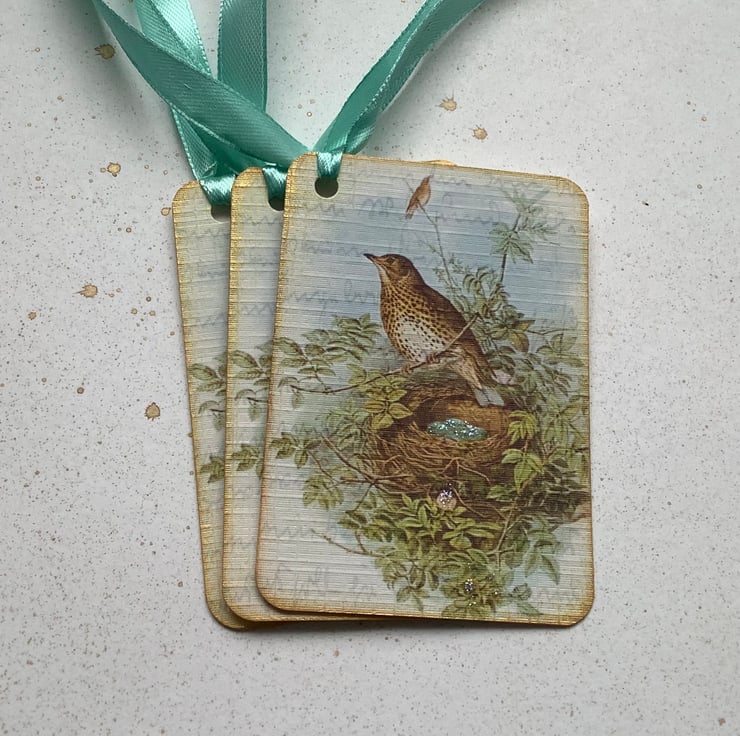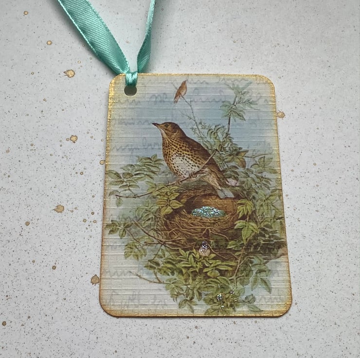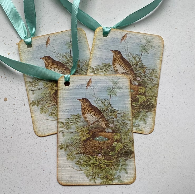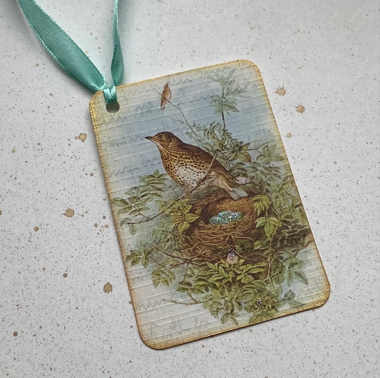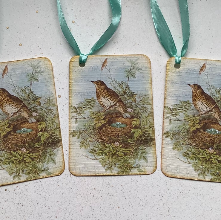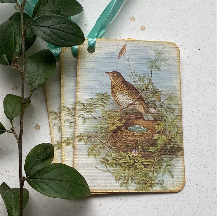 Lovely, vintage image of a Song Thrush and nest layered on a scripted text background . I have printed on to high quality linen-look (300gsm) card ,then added the necessary inks to 'age' them and glitter of course!!! because there has to some shimmer! .Finished with lovely ,silky ribbon !!