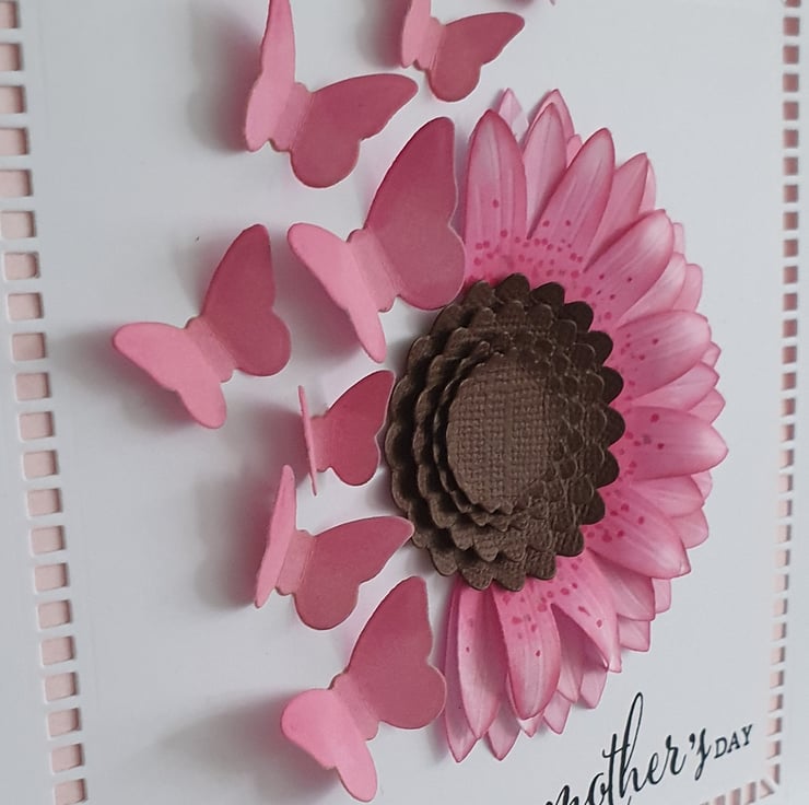 The dusky pink daisy is attached on to a 300gsm, quality card stock which has a pretty hemstitch cut out border enabling the pale pink insert to show through.