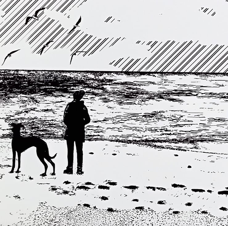 An atmospheric digital giclee print with a woman and her dog standing on a beach, just gazing at the sea and the gulls soaring. A perfect gift for those who enjoy spending time by the sea.
