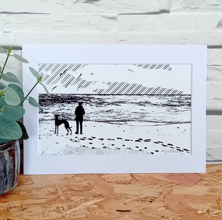 Girl and Dog Print - beach walk, coastal, sea, greyhound, sighthound