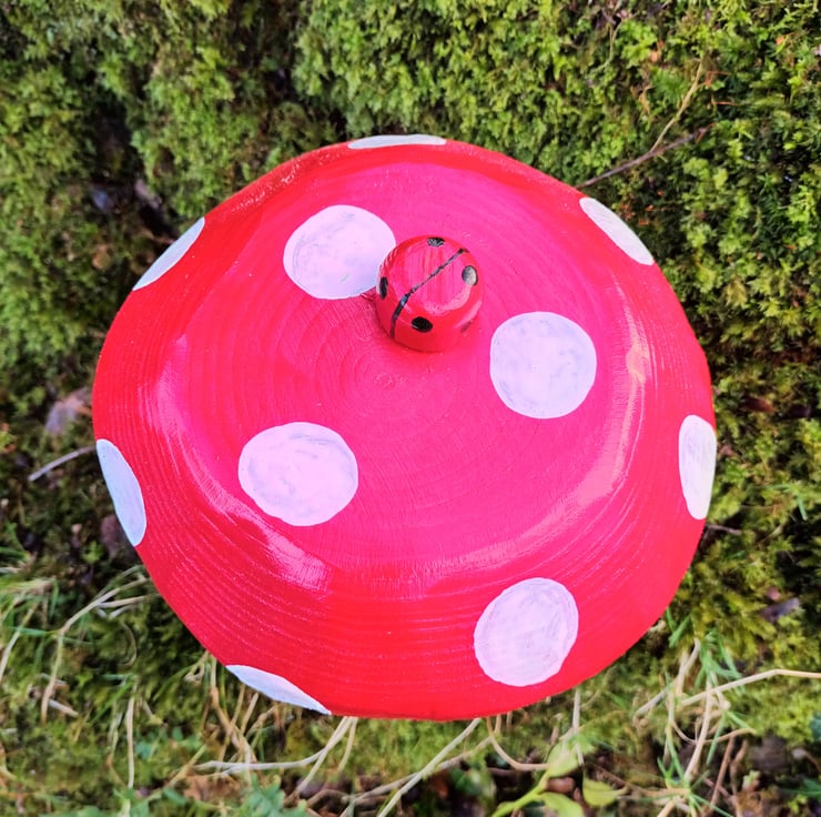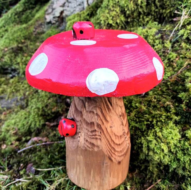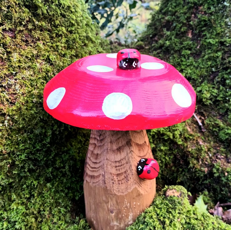 It is made of two pieces of wood securely attached together and has been chainsaw carved then sanded. The spotty top is decorated with weatherproof red and white paints. The little ladybirds are also handmade.