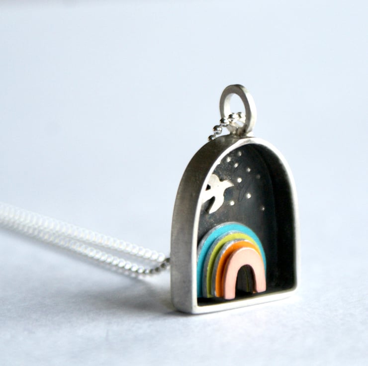 Bring a little bit of joy to your day with this tiny rainbow necklace. It would make a perfect gift for that special someone. The tiny coloured rainbow has been constructed in layers of coloured aluminium and copper which gives a lovely 3D effect. It is set within a sterling silver frame with deep sides, known as a shadow box and has a tiny silver bird flying above it. The inside has been oxidised to a dark grey which really makes the colours pop. There is a tiny engraved heart on the back in the corner.