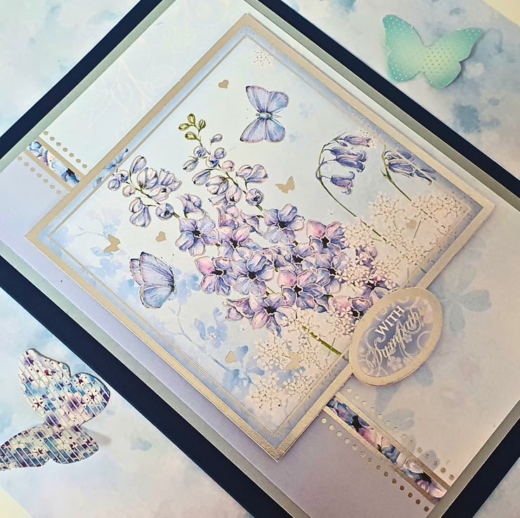The card consists of mats & layers of sage green paper & floral patterned cardstock, on a navy blue card base. It displays a large, square, silver foiled topper, with the image of flowers and butterflies, in soft blue & purple tones. A smaller, oval topper at the bottom of the square, displays the small sentiment "With Sympathy".