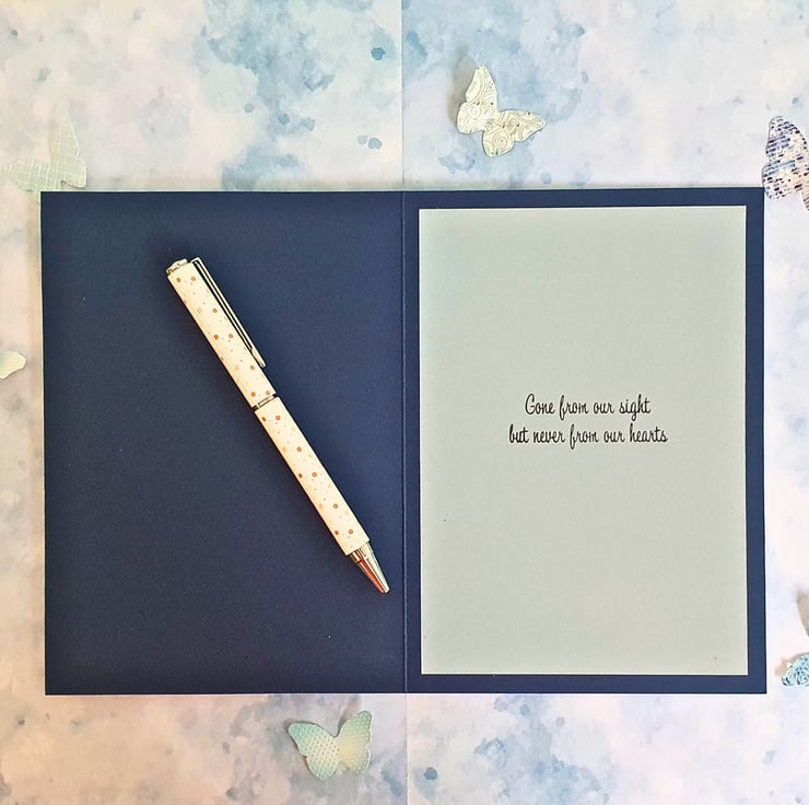 It is finished with a matching sage green insert, with the sentiment "Gone from our sight but never from our hearts" stamped with black ink.
