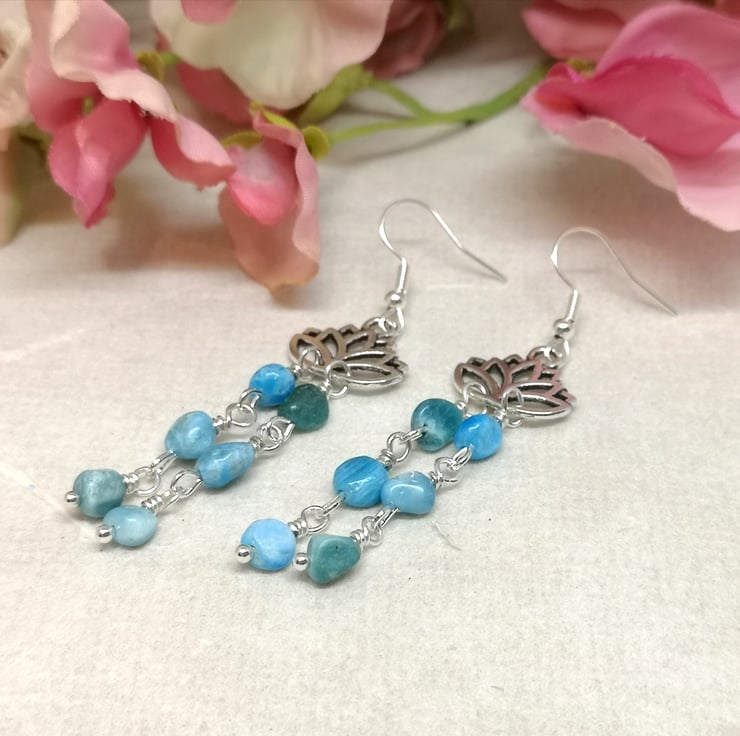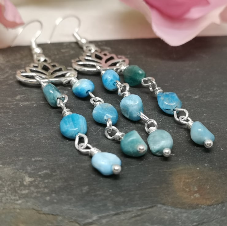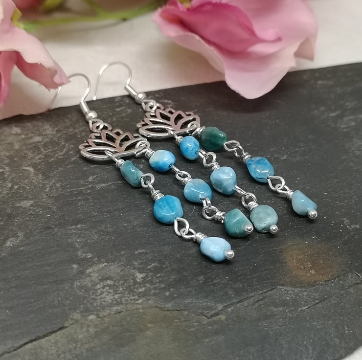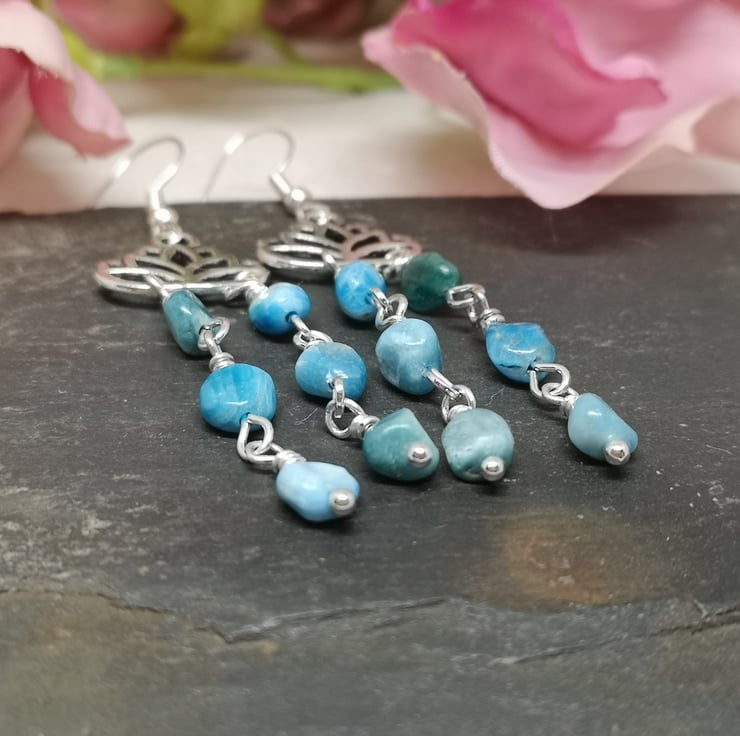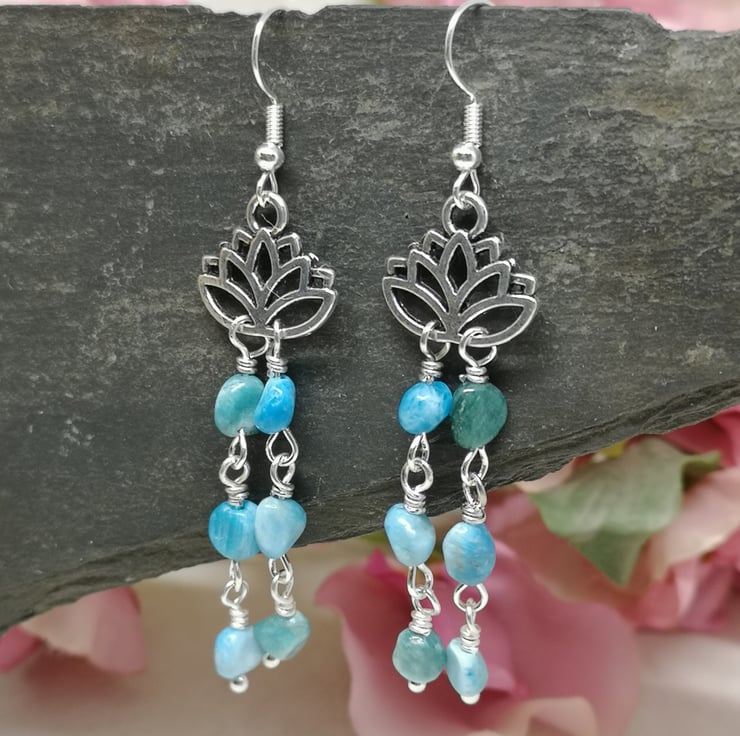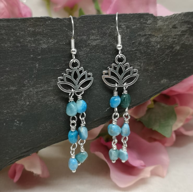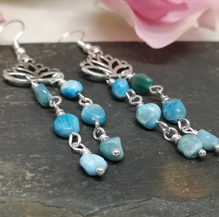 These earrings feature beautiful blue apatite gemstones. Apatite is believed to enhance communication and intuition, and is nicknamed the stone of manifestation. The stones hang beneath a lotus flower charm, which is a symbol of purity and enlightenment. Silver plated ear wires complete them.