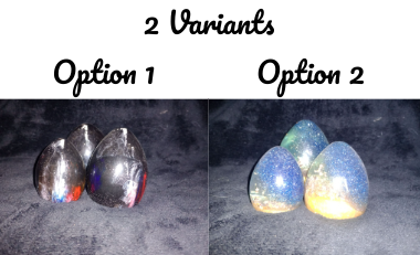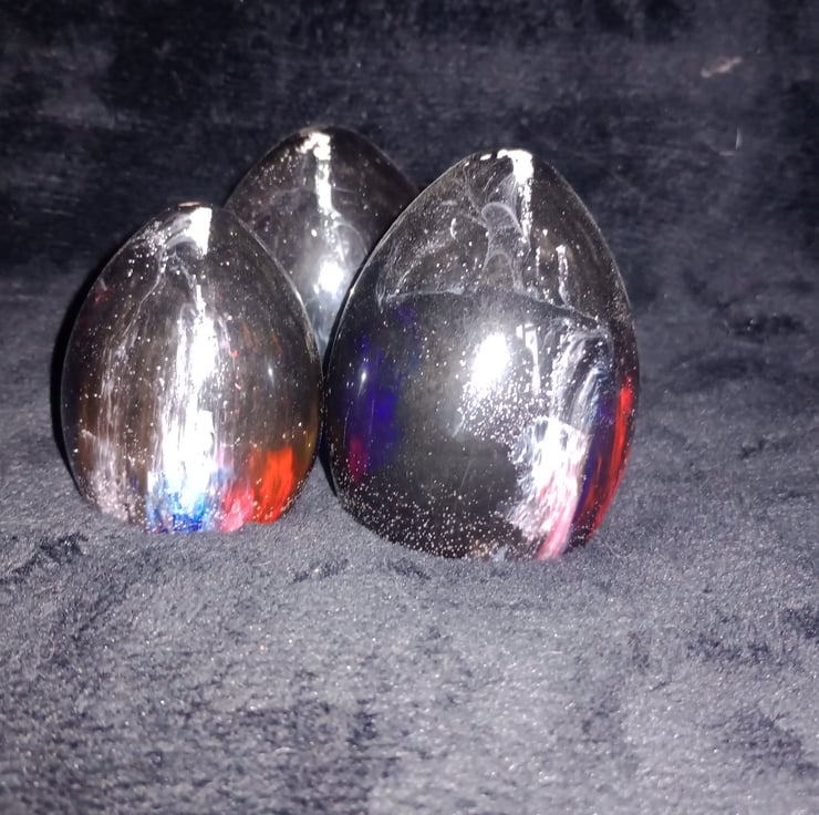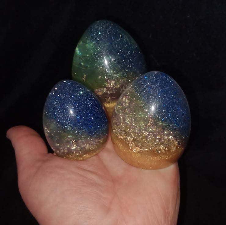 This set of 3 dragon eggs have been made with Epoxy Resin, and coloured with a range of powders, pigments and glitters.
