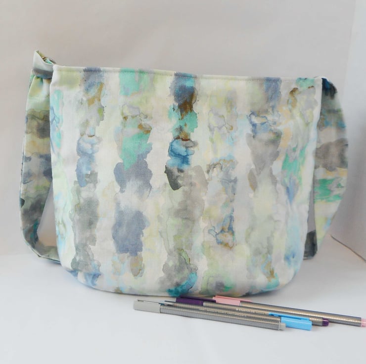 This is a large fabric shoulder bag with adjustable cross body strap. These bags, like most that I make, are soft and unstructured. I use interfacing but not to stiffen fabric, as I prefer a softer, squashier bag.
