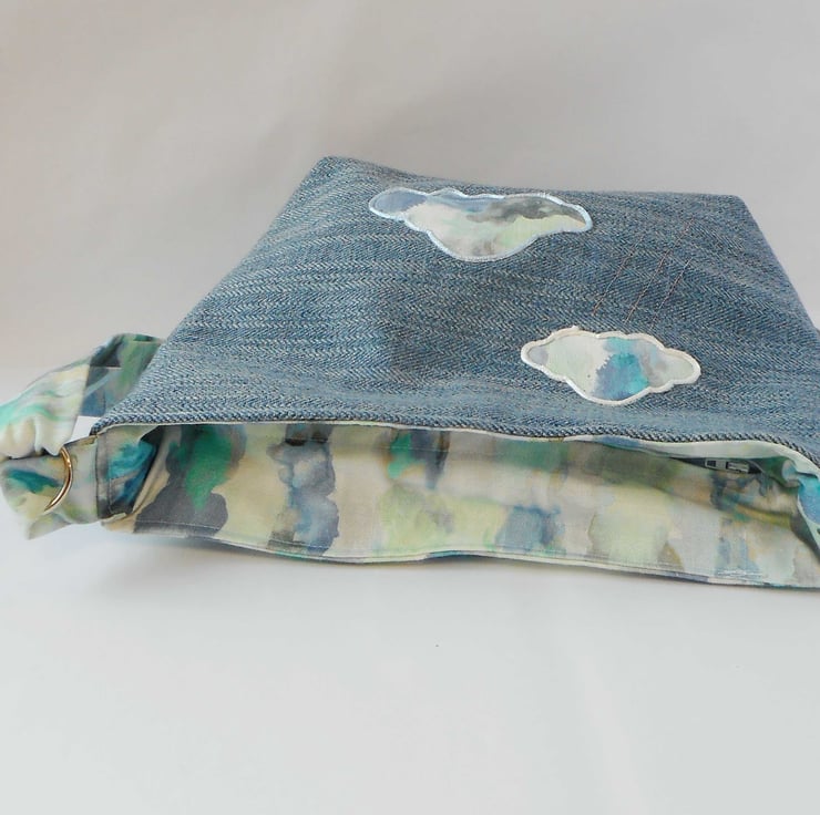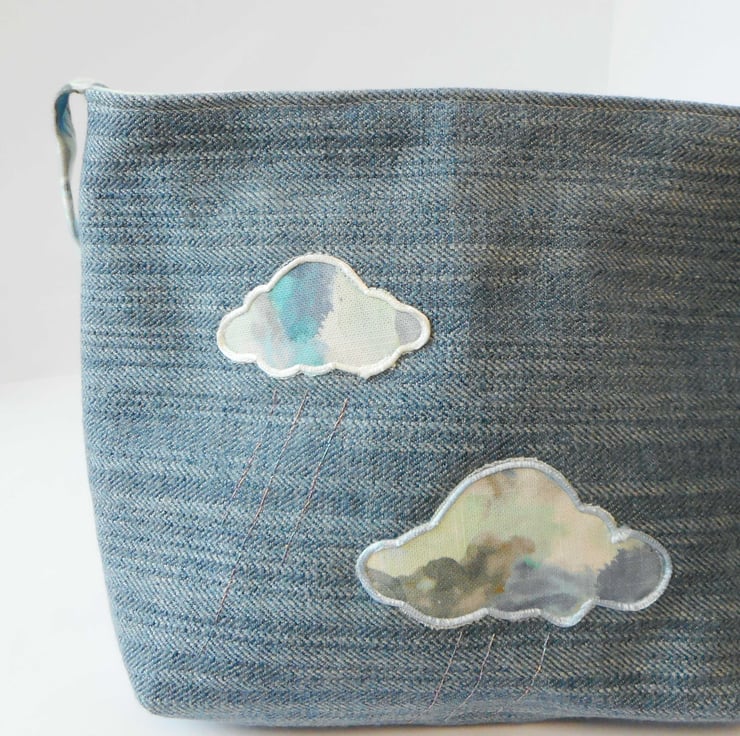 The front fabric is a tweedy woven furnishing offcut in wool fibre - it feels like it may be coated. The back is a printed cotton in a watercolour type design. The front has two appliqued clouds in the watercolour cotton, with hand embroidered "rain" in metallic thread.