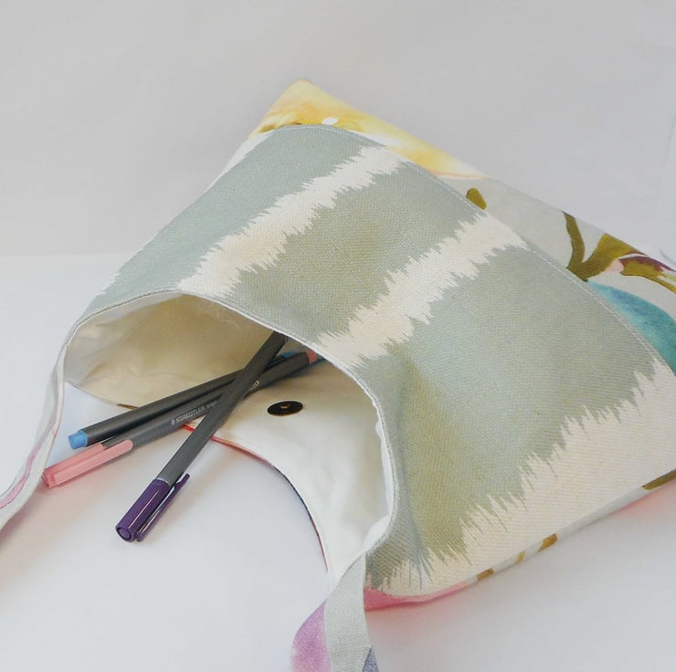 Pyramid shaped bag in printed furnishing fabric, with a magnetic fastening.