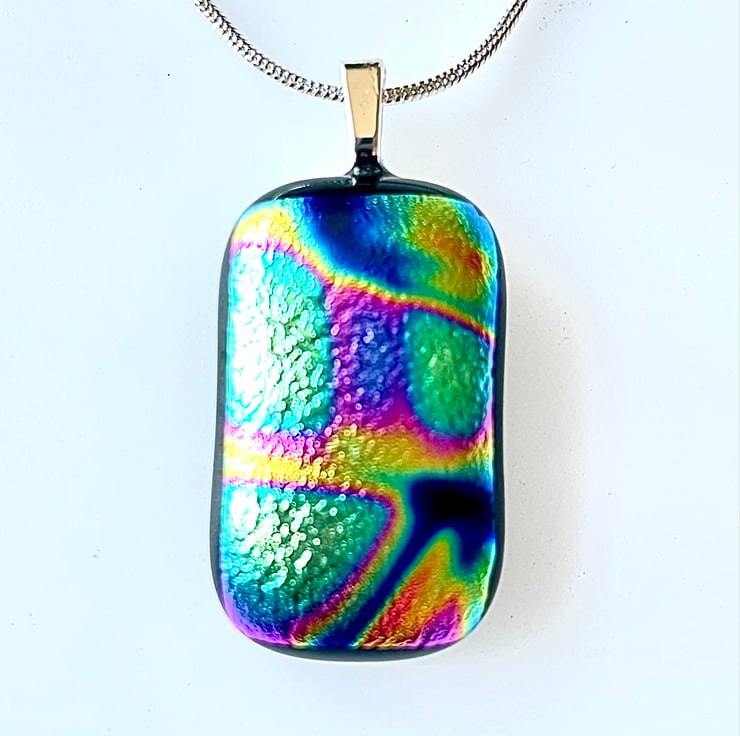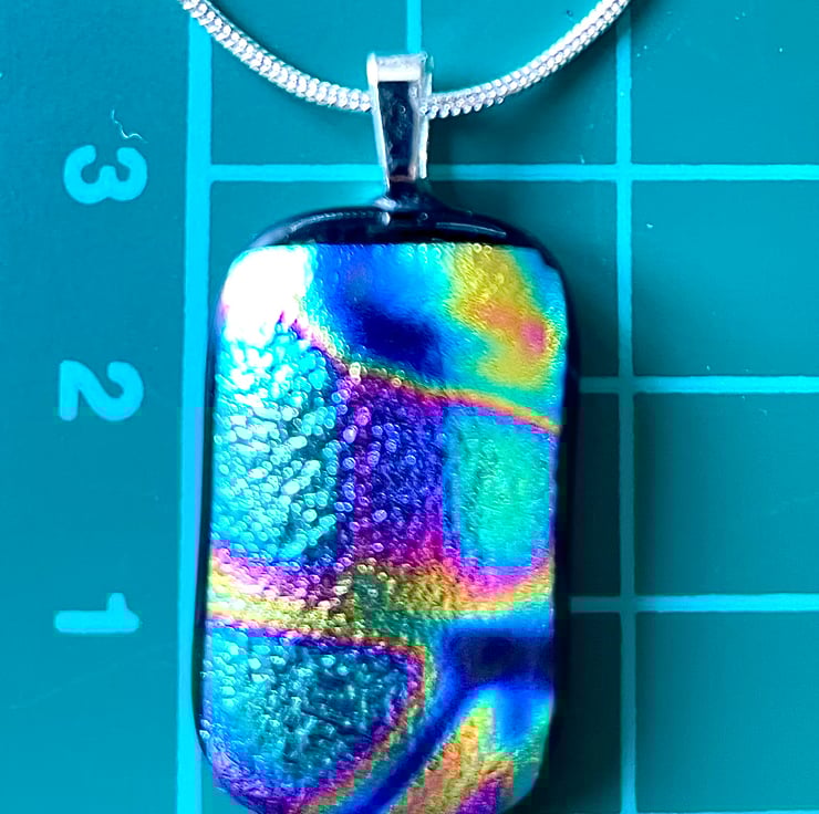 This hand-cut multicoloured glass pendant was made by fusing a layer of patterned dichroic glass to a black base layer to create this stunning multicoloured shimmering pendant. The shimmer is a matt finish rather than glossy. It was fired at 800 degrees Celsius in a specialist glass kiln and gently cooled over a 12 hour period. A silver plated jewellery bail was glued on to the back to hang it on an 18 inch silver plated snake chain. It measures approximately 17mm across and 28mm high.