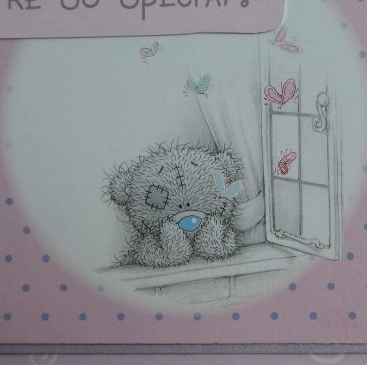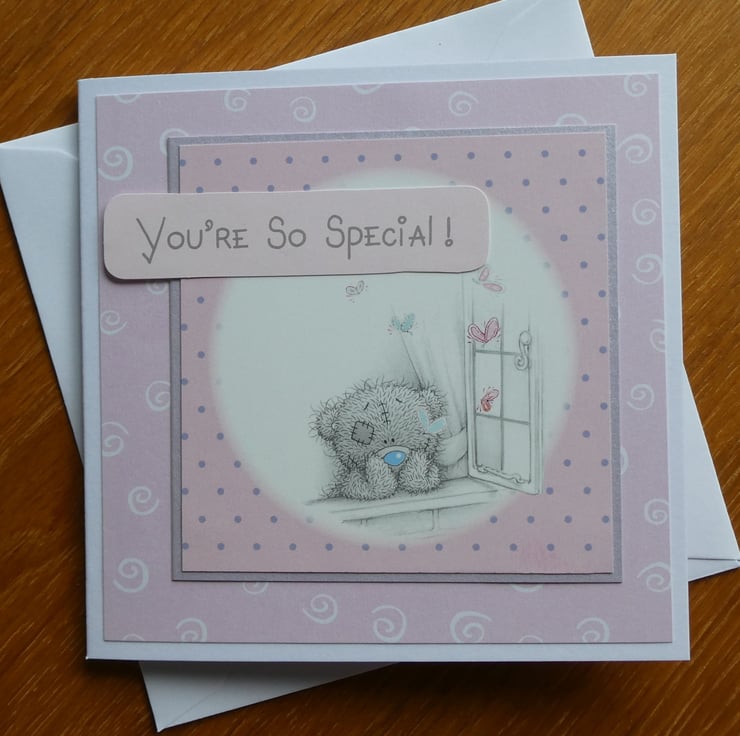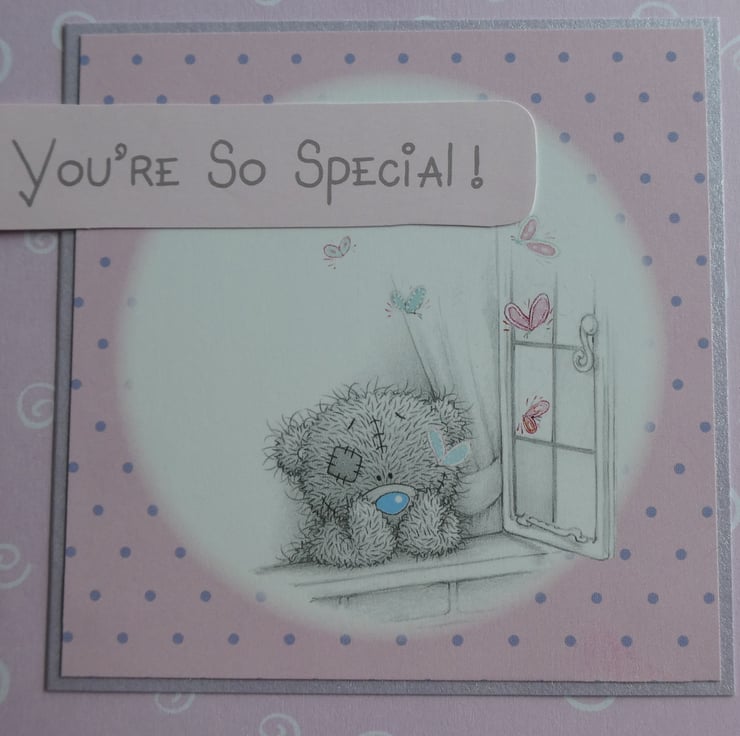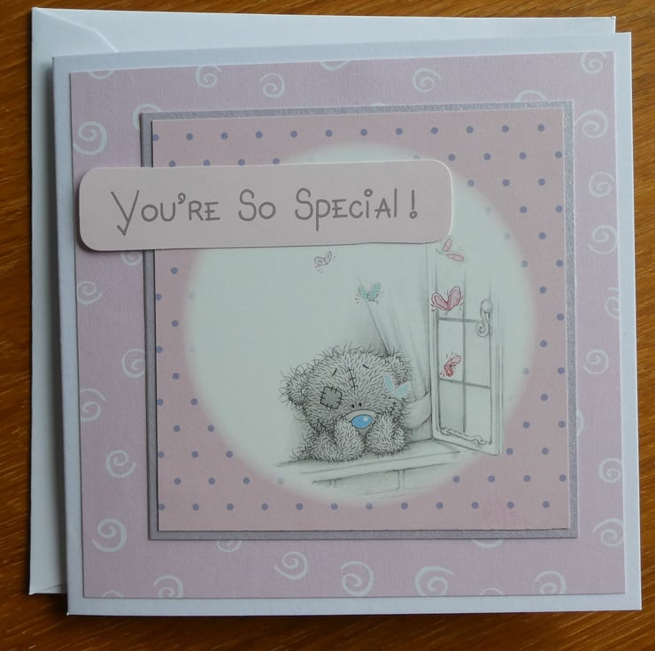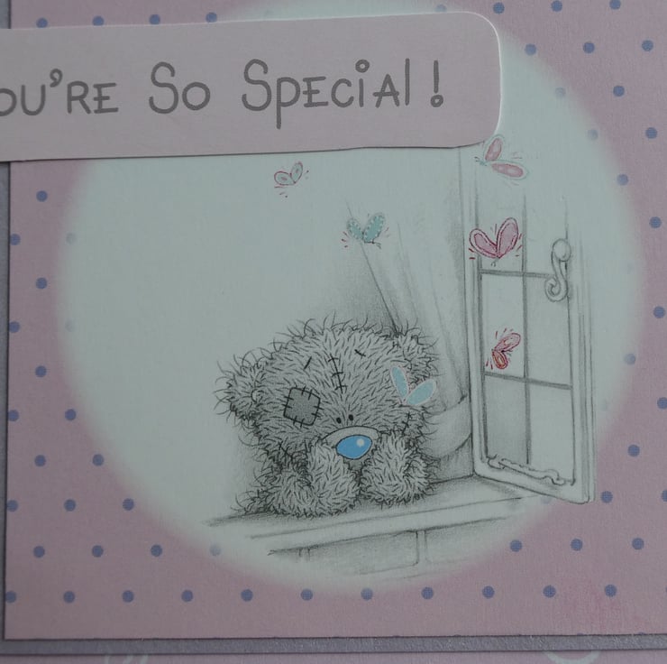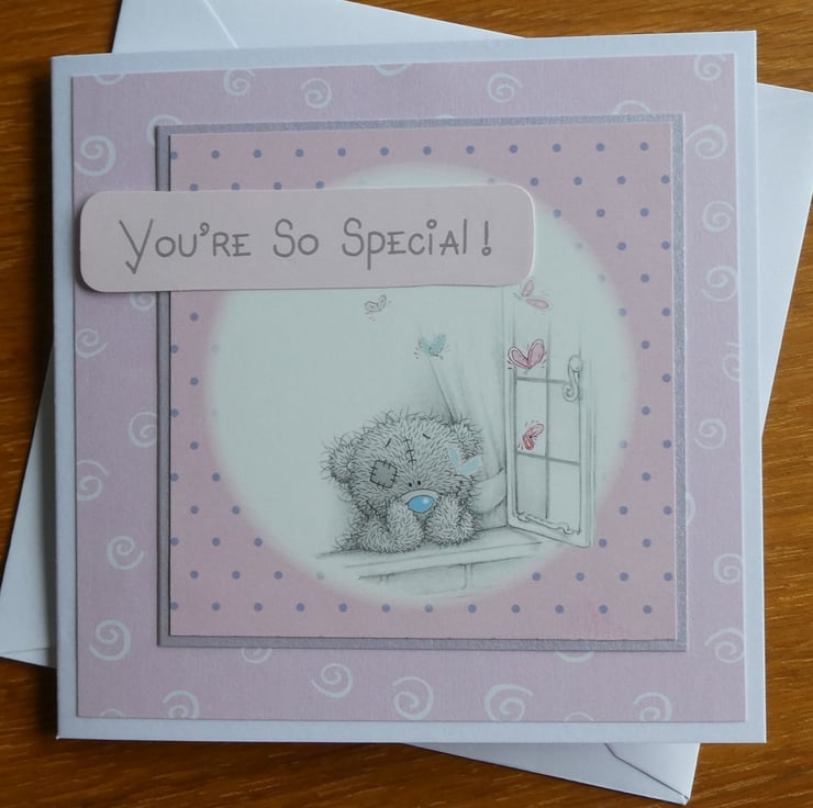 With the message You're So Special this sweet Tatty Teddy card showing a teddy looking wistfully out of a window would be suitable to send for a Birthday, Valentine, Thank You or many other ocassions.