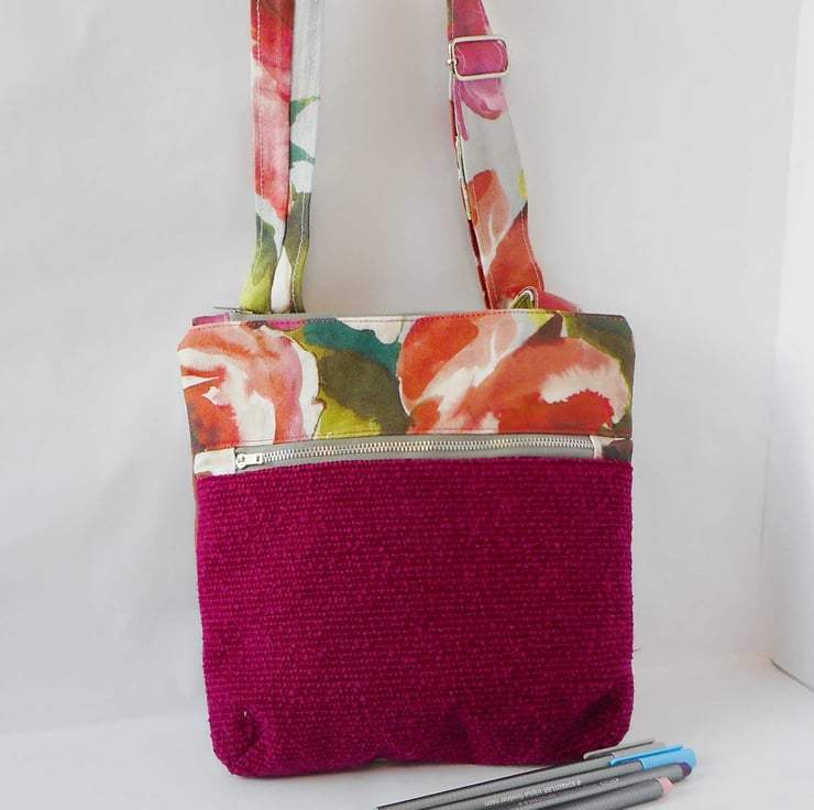 Fabric crossbody bag with zipped pocket on front in bright magenta